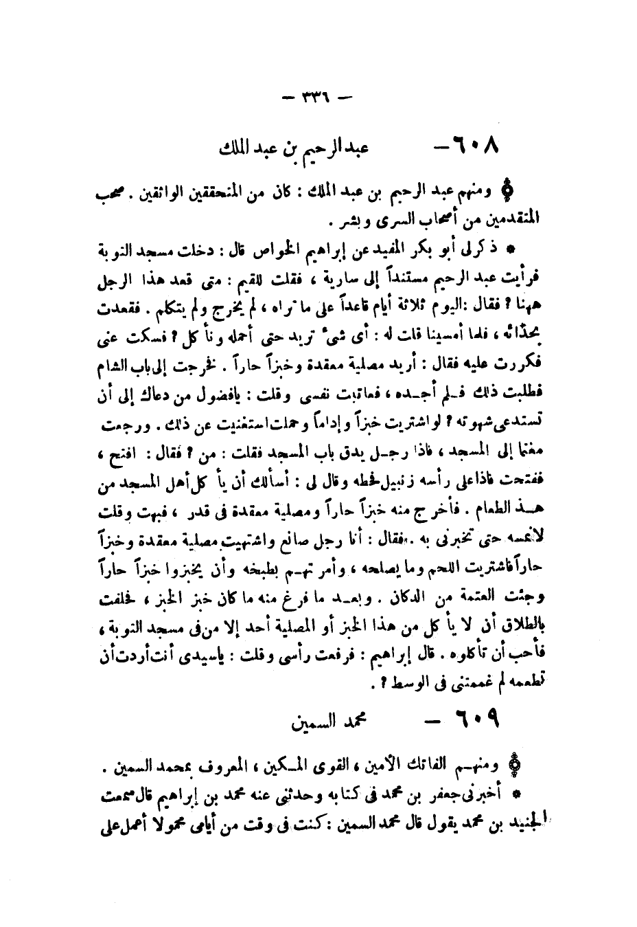 ذَكَرَ لِي أَبُو بَكْرٍ الْمُفِيدُ عَنْ إِبْرَاهِيمَ الْخَوَّاصِ قَالَ: " §دَخَلْتُ مَسْجِدَ التَّوْبَةِ فَرَأَيْتُ عَبْدَ الرَّحِيمِ مُسْتَنِدًا إِلَى سَارِيَةٍ فَقُلْتُ لِلْقَيِّمِ: مَتَى قَعَدَ هَذَا الرَّجُلُ هَاهُنَا؟ فَقَالَ: الْيَوْمَ، ثَلَاثَةُ أَيَّامٍ قَاعِدًا عَلَى مَا تَرَاهُ لَمْ يَخْرُجْ وَلَمْ يَتَكَلَّمْ، فَقَعَدْتُ بِحِذَائِهِ فَلَمَّا أَمْسَيْنَا قُلْتُ لَهُ: أَيَّ شَيْءٍ تُرِيدُ حَتَّى أَحْمِلَهُ وَنَأْكُلَ؟ فَسَكَتَ عَنِّي فَكَرَّرْتُ عَلَيْهِ فَقَالَ: أُرِيدُ مَصْلِيَّةً مُعْقَدَةً وَخُبْزًا حَارًّا، فَخَرَجْتُ إِلَى بَابِ الشَّامِ فَطَلَبْتُ ذَلِكَ فَلَمْ أَجِدْهُ فَعَاتَبْتُ نَفْسِي وَقُلْتُ: يَا فُضُولِيُّ، مَنْ دَعَاكَ إِلَى أَنْ تَسْتَدْعِيَ شَهْوَتَهُ؟ لَوِ اشْتَرَيْتُ خُبْزًا وَإِدَامًا وَحَمَلْتُ اسْتَغْنَيْتُ عَنْ ذَلِكَ، وَرَجَعْتُ مُغْتَمًّا إِلَى الْمَسْجِدِ فَإِذَا رَجُلٌ يَدُقُّ بَابَ الْمَسْجِدِ فَقُلْتُ: مَنْ؟ فَقَالَ: افْتَحْ، فَفَتَحْتُ فَإِذَا عَلَى رَأْسِهِ زِنْبِيلٌ فَحَطَّهُ وَقَالَ لِي: أَسْأَلُكُ أَنْ يَأْكُلَ أَهْلُ الْمَسْجِدِ مِنْ هَذَا الطَّعَامِ، فَأَخْرَجَ مِنْهُ خُبْزًا حَارًّا وَمَصْلِيَّةً مُعْقَدَةً فِي قِدْرٍ فَبُهِتُّ وَقُلْتُ: لَا نَمَسُّهُ حَتَّى تُخْبِرَنِي بِهِ فَقَالَ: أَنا رَجُلٌ صَانِعٌ وَاشْتَهَيْتُ مَصْلِيَّةً مُعْقَدَةً وَخُبْزًا حَارًّا فَاشْتَرَيْتُ اللَّحْمَ وَمَا يُصْلِحُهُ وَأَمَرَتْهُمْ بِطَبْخِهِ وَأَنْ يَخْبُزُوا خُبْزًا حَارًّا وَجِئْتُ الْعَتَمَةَ مِنَ الدُّكَّانِ وَبَعْدَ مَا فَرَغَ مِنْهُ مَا كَانَ خَبَزَ الْخُبْزَ فَحَلَفْتُ بِالطَّلَاقِ أَنْ لَا يَأْكُلَ مِنْ هَذَا الْخُبْزِ أَوِ الْمَصْلِيَّةِ أَحَدٌ إِلَّا مَنْ فِي مَسْجِدِ التَّوْبَةِ فَأُحِبُّ أَنْ تَأْكُلُوهُ، قَالَ إِبْرَاهِيمُ: فَرَفَعْتُ رَأْسِي وَقُلْتُ: يَا سَيِّدِي، أَنْتَ أَرَدْتَ أَنْ تُطْعِمَهُ لِمَ غَمَمْتَنِي فِي الْوَسَطِ؟ "