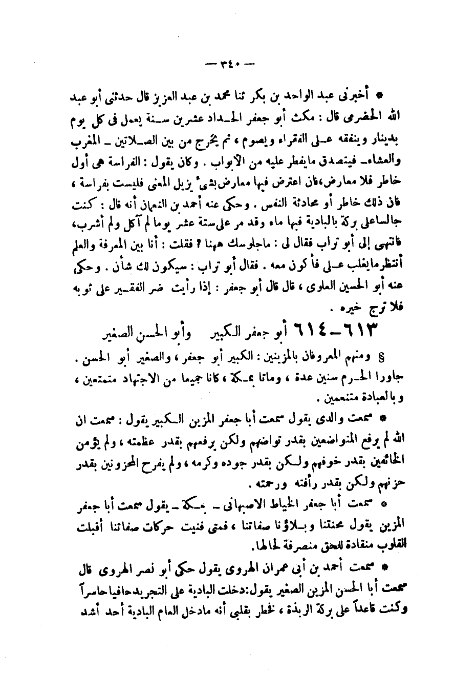 سَمِعْتُ أَبَا جَعْفَرٍ الْخَيَّاطَ الْأَصْبَهَانِيَّ، بِمَكَّةَ يَقُولُ: سَمِعْتُ أَبَا جَعْفَرٍ الْمُزَيِّنَ، يَقُولُ: «§مِحْنَتُنَا وَبَلَاؤُنَا صِفَاتُنَا فَمَتَى فَنِيَتْ حَرَكَاتُ صِفَاتِنَا أَقْبَلَتِ الْقُلُوبُ مُنَقَادَةً لِلْحَقِّ مُنْصَرِفَةً لِحَالِهَا»