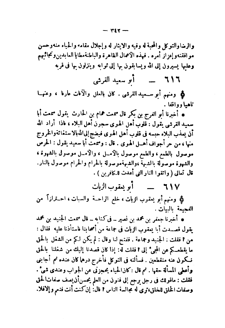 أَخْبَرَنَا جَعْفَرُ بْنُ مُحَمَّدِ بْنِ نُصَيْرٍ، فِي كِتَابِهِ قَالَ: سَمِعْتُ الْجُنَيْدَ بْنَ مُحَمَّدٍ، يَقُولُ: قَصَدْتُ أَبَا يَعْقُوبَ الزَّيَّاتَ فِي جَمَاعَةٍ مِنْ أَصْحَابِنَا فَاسْتَأْذَنَّا عَلَيْهِ فَقَالَ: مَنْ؟ فَقُلْتُ: الْجُنَيْدُ وَجَمَاعَةٌ، فَفَتَحَ لَنَا وَقَالَ: " §لَمْ يَكُنْ لَكُمْ مِنَ الشُّغْلِ بِالْحَقِّ مَا يَقْطَعُكُمْ عَنِ الْمَجِيءِ إِلَيَّ؟ فَقُلْتُ لَهُ: إِذَا كَانَ قَصْدُنَا إِلَيْكَ مِنْ شُغِلْنَا بِالْحَقِّ نَكُونُ عَنْهُ مُنْقَطِعِينَ، فَسَأَلْتُهُ فِي التَّوَكُّلِ فَأَخْرَجَ دِرْهَمًا كَانَ عِنْدَهُ ثُمَّ أَجَابَنِي وَأَعْطَى الْمَسْأَلَةَ حَقَّهَا، ثُمَّ قَالَ: كَانَ الْحَيَاءِ يَحْجِزُنِي عَنِ الْجَوَابِ وَعِنْدِي شَيْءٌ، فَقُلْتُ: مَا قَوْلُكُ فِي رَجُلٍ يَرْجِعُ إِلَى فُنُونٍ مِنَ الْعِلْمِ يُحْسِنُ أَنْ يَصِفَ صِفَاتِ الْحَقِّ وَصِفَاتِ الْخَلْقِ لِلْخَلْقِ؟ تَرَى لَهُ مُجَالَسَةَ النَّاسِ؟ قَالَ: إِنْ كُنْتَ أَنْتَ فَنِعْمَ، وَإِلَّا فَلَا "