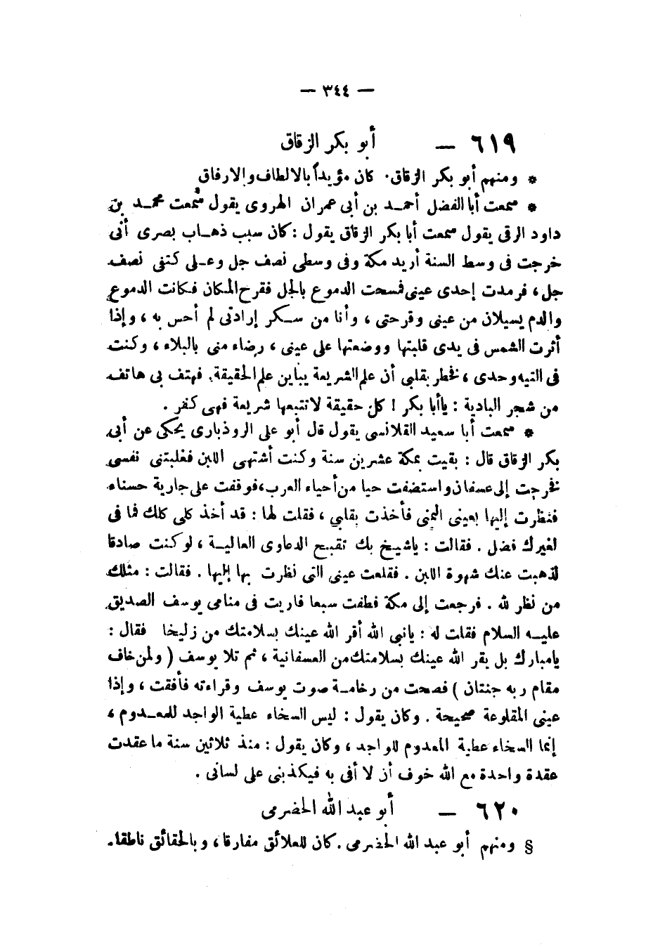 سَمِعْتُ أَبَا سَعِيدٍ الْقَلَانِسِيَّ، يَقُولُ: قَالَ أَبُو عَلِيٍّ الرُّوذْبَارِيُّ، يَحْكِي عَنْ أَبِي بَكْرٍ الزَّقَّاقِ قَالَ: " §بَقِيتُ بِمَكَّةَ عِشْرِينَ سَنَةً وَكُنْتُ أَشْتَهِي اللَّبَنَ فَغَلَبَتْنِي نَفْسِي فَخَرَجْتُ إِلَى عَسَفَانَ وَاسْتَضَفْتُ حَيًّا مِنْ أَحْيَاءِ الْعَرَبِ فَوَقَفَتْ عَلَيَّ جَارِيَةٌ حَسْنَاءُ فَنَظَرْتُ إِلَيْهَا بِعَيْنِي الْيمْنَى فَأَخَذَتْ بِقَلْبِي فَقُلْتُ لَهَا: قَدْ أَخَذَ كُلِّي كُلُّكِ فَمَا فِيَّ لِغَيْرِكِ فَضْلٌ، فَقَالَتْ: يَا شَيْخُ بِكَ تَقْبُحُ الدَّعَاوَى الْعَالِيَةُ، لَوْ كُنْتَ صَادِقًا لَذَهَبَتْ عَنْكَ شَهْوَةُ اللَّبَنِ، فَقَلَعْتُ عَيْنِي الَّتِي نَظَرْتُ بِهَا إِلَيْهَا، فَقَالَتْ: مِثْلُكَ مَنْ نَظَرَ لِلَّهِ، فَرَجَعْتُ إِلَى مَكَّةَ فَطُفْتُ سَبْعًا فَرَأَيْتُ فِيَ مَنَامِي يُوسُفَ الصِّدِّيقَ عَلَيْهِ السَّلَامُ فَقُلْتُ لَهُ: يَا نَبِيَّ اللَّهِ أَقَرَّ اللَّهُ عَيْنَكَ بِسَلَامَتِكَ مِنْ زُلَيْخَا فَقَالَ: يَا مُبَارَكُ، بَلْ يُقِرُّ اللَّهُ عَيْنَكَ بِسَلَامَتِكَ مِنَ الْعَسَفَانِيَّةِ ثُمَّ تَلَا يُوسُفُ {وَلِمَنْ خَافَ مَقَامَ رَبِّهِ جَنَّتَانِ} [الرحمن: 46]، فَصِحْتُ مِنْ رَخَامَةِ صَوْتِ يُوسُفَ وَقِرَاءَتِهِ فَأَفَقْتُ وَإِذَا عَيْنِي الْمَقْلُوعَةُ صَحِيحَةٌ، وَكَانَ يَقُولُ: لَيْسَ السَّخَاءُ عَطِيَّةَ الْوَاحِدِ لِلْمَعْدُومِ إِنَّمَا السَّخَاءُ عَطِيَّةُ الْمَعْدُومِ لِلْوَاحِدِ وَكَانَ يَقُولُ: مُنْذُ ثَلَاثِينَ سَنَةً مَا عَقَدْتُ عُقْدَةً وَاحِدَةً مَعَ اللَّهِ خَوْفَ أَنْ لَا أَفِيَ بِهِ فَيُكَذِّبَنِي عَلَى لِسَانِي "