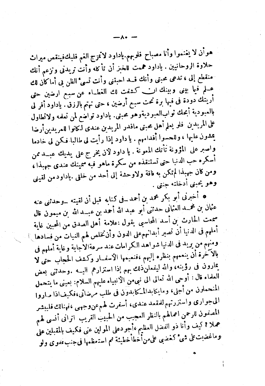 أَخْبَرَنِي أَبُو بَكْرٍ مُحَمَّدُ بْنُ أَحْمَدَ فِي كِتَابِهِ قَبْلَ أَنْ لَقِيتُهُ , وَحَدَّثَنِي عَنْهُ عُثْمَانُ بْنُ مُحَمَّدٍ الْعُثْمَانِيُّ، حَدَّثَنِي أَبُو عَبْدِ اللَّهِ أَحْمَدُ بْنُ عَبْدِ اللَّهِ بْنِ مَيْمُونٍ قَالَ: سَمِعْتُ الْحَارِثَ بْنَ أَسَدٍ الْمُحَاسِبِيَّ، يَقُولُ: «§عَلَامَةُ أَهْلِ الصِّدْقِ مِنَ الْمُحِبِّينَ وَغَايَةُ أَمَلِهِمْ فِي الدُّنْيَا أَنْ تَصْبِرَ أَبْدَانُهُمْ عَلَى الدُّونِ وَأَنْ تَخْلُصُ لَهُمُ النِّيَّاتُ مِنْ فَسَادِهَا وَمِنْهُمْ مَنْ يُرِيدُ فِي الدُّنْيَا شَوَاهِدَ الْكَرَامَاتِ عِنْدَ سُرْعَةِ الْإِجَابَةِ، وَغَايَةَ أَمَلِهِمْ فِي الْآخِرَةِ أَنْ يُنَعِّمَهُمْ بِنَظَرَهِ إِلَيْهِمْ فَنَعِيمُهَا الْإِسْفَارُ وَكَشَفُ الْحِجَابِ حَتَّى لَا يُمَارُونَ فِي رُؤْيَتِهِ، وَاللَّهِ لَيَفْعَلَنَّ ذَلِكَ بِهِمْ إِذَا اسْتَزَارَهُمْ إِلَيْهِ» وَحَدَّثَنِي بَعْضُ الْعُلَمَاءِ قَالَ: " أَوْحَى اللَّهُ تَعَالَى إِلَى نَبِيٍّ مِنَ الْأَنْبِيَاءِ عَلَيْهِمُ السَّلَامُ: بِعَيْنَيَّ مَا يَتَحَمَّلُ الْمُتَحَمِّلُونَ مِنْ أَجْلِي وَمَا يُكَابِدُ الْمُكَابِدُونَ فِي طَلَبِ مَرْضَاتِي فَكَيْفَ إِذَا صَارُوا إِلَى جَوَارِي وَاسْتَزَرْتُهُمْ لِلْمَقْعَدِ عِنْدِي أَسْفَرْتُ لَهُمْ عَنْ وَجْهِي، فَهُنَالِكَ فَلْيُبْشِرِ الْمُصْفُونَ لِلرَّحْمَنِ أَعْمَالَهُمْ بِالنَّظَرِ الْعَجِيبِ مِنَ الْحَبِيبِ الْقَرِيبَ أَتُرَانِي أَنْسَى لَهُمْ عَمَلًا كَيْفَ وَأَنَا ذُو الْفَضْلِ الْعَظِيمِ؟ أَجْوَدُ عَلَى الْمُوَلِّينَ عَنِّي فَكَيْفَ بِالْمُقْبِلِينَ عَلَيَّ وَمَا غَضِبْتُ عَلَى شَيْءٍ كَغَضَبِي عَلَى مَنْ أَخْطَأَ خَطِيئَةً ثُمَّ اسْتَعْظَمَهَا فِي جَنْبِ عَفْوِي وَلَوْ -[81]- عَاجَلْتُ أَحَدًا بِالْعُقُوبَةِ لَعَاجَلْتُ الْقَانِطِينَ مِنْ رَحْمَتِي وَلَوْ يَرَانِي عِبَادِي كَيْفَ أَسْتَوْهِبُهُمْ مِمَّنِ اعْتَدَوْا عَلَيْهِمْ بِالظُّلْمِ فِي دَارِ الدُّنْيَا ثُمَّ أَوْجَبْتُ لِمَنْ وَهَبَهَمُ النَّعِيمَ الْمُقِيمَ لَمَا اتَّهِمُوا فَضْلِي وَكَرَمِي وَلَوْ لَمْ أَشْكُرْ عِبَادِي إِلَّا عَلَى خَوْفِهِمْ مِنَ الْمَقَامِ بَيْنَ يَدَيَّ لَشَكَرْتُهُمْ عَلَى ذَلِكَ وَلَوْ يَرَانِي عِبَادِي كَيْفَ أَرْفَعُ قُصُورًا تَحَارُ فِيهَا الْأَبْصَارُ فَيُقَالُ: لِمَنْ هَذِهِ؟ فَأَقُولُ: «لِمَنْ عَصَانِي وَلَمْ يَقْطَعْ رَجَاءً مِنِّي فَأَنَا الدَّيَّانُ الَّذِي لَا تَحِلُّ مَعْصِيَتِي وَلَا حَاجَةَ بِي إِلَى هَوَانِ مَنْ خَافَ مَقَامِي»