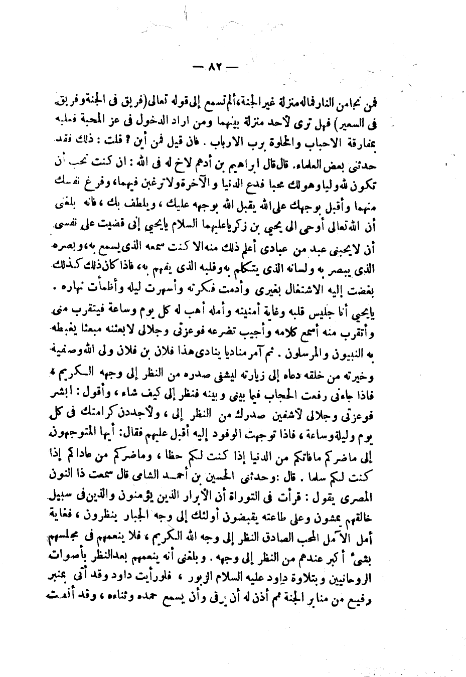 قَالَ: وَحَدَّثَنِي الْحُسَيْنُ بْنُ أَحْمَدَ الشَّامِيُّ قَالَ: سَمِعْتُ ذَا النُّونِ الْمِصْرِيَّ، يَقُولُ: قَرَأْتُ فِي التَّوْرَاةِ أَنَّ الْأَبْرَارَ الَّذِينَ يُؤْمِنُونَ وَالَّذِينَ فِي سَبِيلِ خَالِقِهِمْ يَمْشُونَ وَعَلَى طَاعَتِهِ يَقْبِضُونَ §أُولَئِكَ إِلَى وَجْهِ الْجَبَّارِ يَنْظُرُونَ فَغَايَةُ أَمَلِ الْآمِلِ الْمُحِبِّ الصَّادِقِ النَّظَرُ إِلَى وَجْهِ اللَّهِ الْكَرِيمِ فَلَا يُنَعِّمُهُمْ فِي مَجْلِسِهِمْ بِشَيْءٍ أَكْبَرَ عِنْدَهُمْ مِنَ النَّظَرِ إِلَى وَجْهِهِ، وَبَلَغَنِي أَنَّهُ يُنَعِّمُهُمْ بَعْدَ النَّظَرِ بِأَصْوَاتِ الرُّوحَانِيِّنَ وَبِتِلَاوَةِ دَاودَ عَلَيْهِ السَّلَامُ الزَّبُورَ فَلَوْ رَأَيْتَ دَاودَ وَقَدْ أَتَى بِمِنْبَرٍ رُفَيْعٍ مِنْ مَنَابِرِ الْجَنَّةِ ثُمَّ أُذِنَ لَهُ أَنْ يَرْقَى وَأَنْ يُسْمِعَ حَمْدَهُ وَثَنَاءَهُ وَقَدْ أَنْصَتَ -[83]- لَهُ جَمِيعُ أَهْلِ الْجَنَّةِ مِنَ الْأَنْبِيَاءِ وَالْأَوْلِيَاءِ وَالرُّوحَانِيِّينَ وَالْمُقَرَّبِينَ ثُمَّ ابْتَدَأَ دَاودُ بِتِلَاوَةِ الزَّبُورِ عَلَى سُكُونِ الْقَلْبِ عِنْدَ حُسْنِ حِفْظِهِ وَتَرْجِيعِهِ وَتَسْكِينِهِ الصَّوْتَ وَحُسْنِ تَقْطِيعِهِ وَقَدْ وُكِّلَ بِهَا زَمْعُهَا وَفَاحَ مِنْهَا طَرَبُهَا وَقَدْ بَدَتِ النَّوَاجِذُ مِنَ الضَّاحِكِينَ بِحَبْرَةِ السُّرُورِ وَأَجَابَ دَاودَ هَوَاءُ الْمَلَكُوتِ وَفُتِحَتْ مَقَاصِيرُ الْقُصُورِ ثُمَّ رَفَعَ دَاودُ عَلَيْهِ السَّلَامُ مِنْ صَوْتِهِ لِيُتِمَّ سُرُورَهُمْ فَلَمَّا أَسْمَعَهُمُ الرَّفِيعَ مِنْ صَوْتِهِ بَرَزَ أَهْلُ عِلِّيِّينَ مِنْ غُرَفِ الْجَنَّةِ وَأَجَابَتْهُ الْحُورُ مِنْ وَرَاءِ سُتْرَاتِ الْخُدُورِ بِمُفْتِنَاتِ النَّغَمِ وَأَطَّتْ رِحَالُ الْمِنْبَرِ، وَاصْطَفَقَتِ الرِّيَاحُ فَزَعْزَعَتِ الْأَشْجَارَ فَتَرَاسَلَتِ الْأَصْوَاتُ وَتَجَاوَبَتِ النَّغَمُ، وَزَادَهُمُ الْمَلِيكُ الْفَهْمَ لِيُتِمَّ مَا بِهِمْ مِنَ النِّعَمِ فَلَوْلَا أَنَّ اللَّهَ كَتَبَ لَهُمْ فِيهَا الْبَقَاءَ لَمَاتُوا فَرَحًا، قُلْتُ: فَهَلْ قَالَتِ الْعُلَمَاءُ فِي صِفَةِ يَوْمِ الزِّيَارَةِ شَيْئًا تَصِفُهُمْ بِهِ؟ قَالَ: نَعَمْ، اجْتَمَعَ جَمَاعَةٌ مِنَ الْعُبَّادِ فَأَتَوْا عَابِدًا فِي بَيْتِهِ فَقَالُوا لَهُ: قُلْ خَيْرًا وَأَوْصِنا بِوَصِيَّةٍ فَقَالَ: اقْطَعُوا الدَّهْرَ إِخْوَتِي بِمُنَاجَاةِ رَبِّكُمْ وَاجْعَلُوا لَكُمْ هَمَّا وَاحِدًا فَهُوَ أَهْنَأُ لِعَيْشِكُمْ قِيلَ لَهُ: فَمَا مِيرَاثُ ذَلِكَ إِذَا نَحْنُ فَعَلْنَاهُ فَقَالَ:
