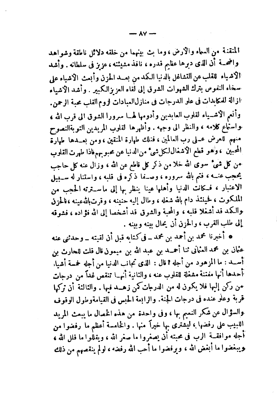 أَخْبَرَنَا مُحَمَّدُ بْنُ أَحْمَدَ بْنِ مُحَمَّدٍ، فِي كِتَابِهِ قَبْلَ أَنّْ لَقِيتُهُ , وَحَدَّثَنِي عَنْهُ عُثْمَانُ بْنُ مُحَمَّدٍ الْعُثْمَانِيُّ، ثنا أَحْمَدُ بْنُ عَبْدِ اللَّهِ بْنِ مَيْمُونٍ قَالَ: قُلْتُ لِلْحَارِثِ بْنِ أَسَدٍ: مَا الْمَزْهُودُ مِنْ أَجْلِهِ؟ قَالَ: " §الَّذِي تُجَانِبُ الدُّنْيَا مِنْ أَجْلِهِ خَمْسَةُ أَشْيَاءَ: أَحَدُهَا أَنَّهَا مُفْتِنَةٌ مُشْغِلَةٌ لِلْقُلُوبِ عَنْهُ، وَالثَّانِيَةُ أَنَّهَا تُنْقِصُ غَدًا مِنْ دَرَجَاتِ مَنْ رَكَنَ إِلَيْهَا فَلَا يَكُونُ لَهُ مِنَ الدَّرَجَاتِ كَمَنْ زَهِدَ فِيهَا، وَالثَّالِثَةُ أَنَّ تَرْكَهَا قُرْبَةٌ وَعُلُوٌّ عِنْدَهُ فِي دَرَجَاتِ الْجَنَّةِ، وَالرَّابِعَةُ الْحَبْسُ فِي الْقِيَامَةِ وَطُولُ الْوقُوفِ، وَالسُّؤَالُ عَنْ شُكْرِ النَّعِيمِ بِهَا وَفِي وَاحِدَةٍ مِنْ هَذِهِ الْخِصَالِ مَا يَبْعَثُ الْمُرِيدُ اللَّبِيبُ عَلَى رَفْضِهَا لِيَشْتَرِيَ بِهَا خَيْرًا مِنْهَا، وَالْخَامِسَةُ أَعْظَمُ مَا رَفَضُوا مِنْ أَجْلِهِ مُوَافَقَةَ الرَّبِّ فِي مَحَبَّتِهِ أَنْ يُصَغِّرُوا مَا صَغَّرَ اللَّهُ، وَيُقَلِّلُوا مَا قَلَّلَ اللَّهُ وَيُبِغِضُوا مَا أَبْغَضَ اللَّهُ وَيَرْفُضُوا مَا أَحَبَّ اللَّهُ رَفْضَهُ لَوْ لَمْ يُنْقِصُهُمْ مِنْ ذَلِكَ -[88]- وَلَمْ يَشْغَلُهُمْ فِي دُنْيَاهُمْ عَنْ طَاعَتِهِ وَلَمْ يَغْفُلُوا عَنْ شُكْرِهِ وَكَانَ ثَوَابُ الرَّافِضِ لَهَا فِي الْآخِرَةِ وَالرَّاكِنِ إِلَيْهَا وَاحِدًا وَكَانَ اللَّهُ عَزَّ وَجَلَّ أَهْلًا أَنْ يُبْغِضَ مَا أَبْغَضَ وَيَتَهَاوَنَ بِمَا أَهَانَ عَلَيْهِ وَذَلِكَ زُهْدُ الْمُحِبِّينَ لَهُ الْمُعَظِّمِينَ الْمُجِلِّينَ، وَقَدْ دَلَّ اللَّهُ عَزَّ وَجَلَّ عَلَى هَذِهِ الْخَمْسِ خِصَالٍ بِكِتَابِهِ وَسُنَّةِ نَبِيِّهِ صَلَّى اللهُ عَلَيْهِ وَسَلَّمَ وَمَا نَطَقَ بِهِ أَهْلُ الْخَاصَّةِ مِنْ عِبَادِهِ الْحُكَمَاءِ الْعُلَمَاءِ "