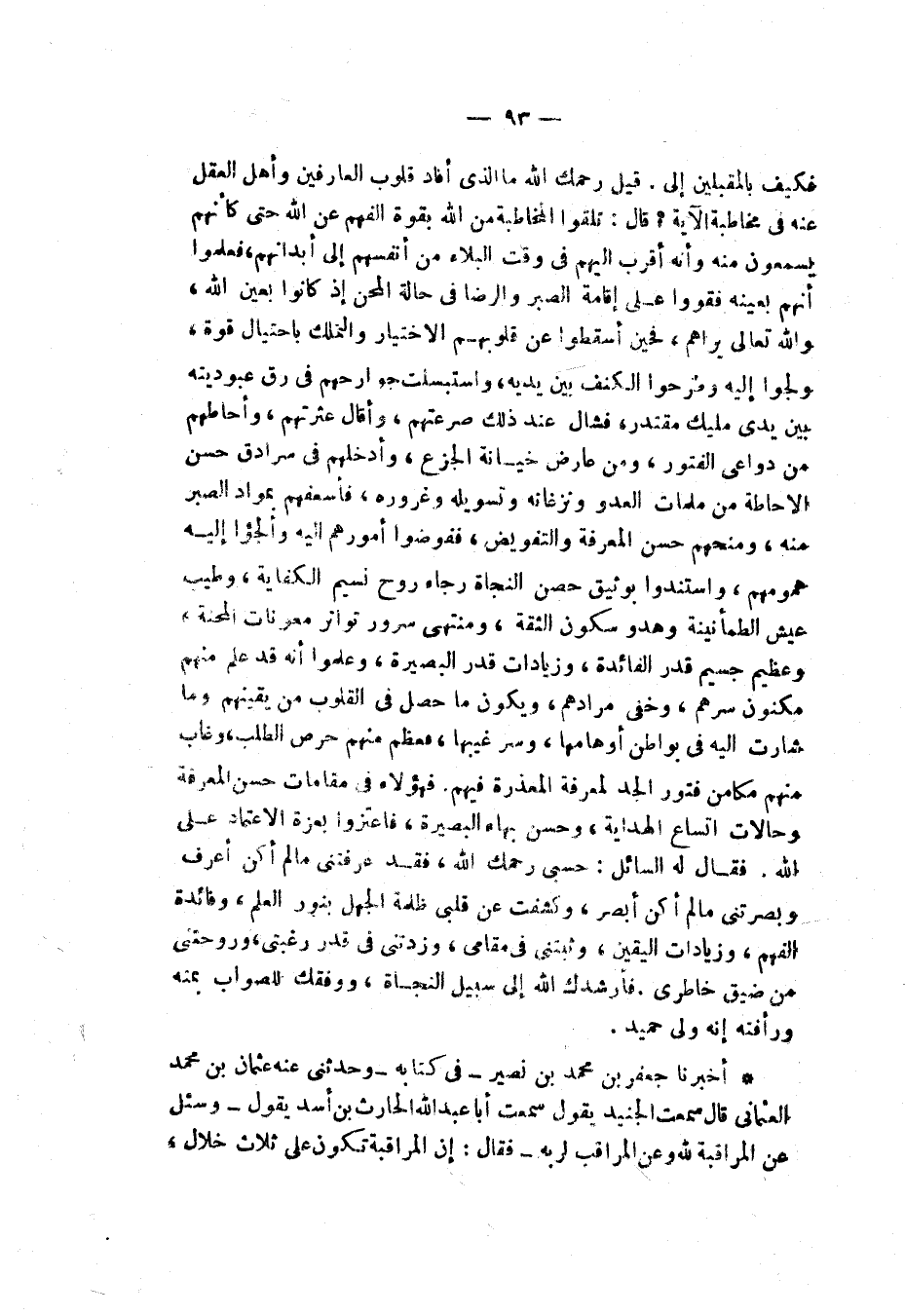 أَخْبَرَنَا جَعْفَرُ بْنُ مُحَمَّدِ بْنِ نُصَيْرٍ، فِي كِتَابِهِ , وَحَدَّثَنِي عَنْهُ عُثْمَانُ بْنُ مُحَمَّدٍ الْعُثْمَانِيُّ قَالَ: سَمِعْتُ الْجُنَيْدَ، يَقُولُ: سَمِعْتُ أَبَا عَبْدِ اللَّهِ الْحَارِثَ بْنَ أَسَدٍ، يَقُولُ وَسُئِلَ عَنِ الْمُرَاقَبَةِ لِلَّهِ وَعَنِ الْمُرَاقِبِ، لِرَبِّهِ فَقَالَ: " إِنَّ §الْمُرَاقَبَةَ تَكُونُ عَلَى ثَلَاثِ خِلَالٍ -[94]- عَلَى قَدْرِ عَقْلِ الْعَاقِلِينَ وَمَعْرِفَتِهِمْ بِرَبِّهِمْ يَفْتَرِقُونَ فِي ذَلِكَ فَإِحْدَى الثَّلَاثِ الْخَوْفُ مِنَ اللَّهِ، وَالْخَلَّةُ الثَّانِيَةُ الْحَيَاءُ مِنَ اللَّهِ وَالْخَلَّةُ الثَّالِثَةُ الْحُبُّ لِلَّهِ فَأَمَّا الْخَائِفُ فَمُرَاقِبٌ بِشِدَّةِ حَذَرٍ مِنَ اللَّهِ تَعَالَى وَغَلَبَةِ فَزَعٍ، وَأَمَّا الْمُسْتَحْيِي مِنَ اللَّهِ فَمُرَاقِبٌ بِشِدَّةِ انِكْسَارٍ وَغَلَبَةِ إِخْبَاتٍ، وَأَمَّا الْمُحِبُّ فَمُرَاقِبٌ بِشِدَّةِ سُرُورٍ وَغَلَبَةِ نَشَاطٍ وَسَخَاءِ نَفْسٍ مَعَ إِشْفَاقٍ لَا يُفَارِقُهُ وَلَنْ تَكَادَ أَنْ تَخْلُوَ قُلُوبُ الْمُرَاقِبِينَ مِنْ ذِكْرِ اطِّلَاعِ الرَّقِيبِ بِشِدَّةِ حَذَرٍ مِنْ قُلُوبِهِمْ أَنْ يَرَاهُمْ غَافِلِينَ عَنْ مُرَاقَبَتِهِ، وَالْمُرَاقَبَةُ ثَلَاثُ خِلَالٍ فِي ثَلَاثَةِ أَحْوَالٍ أَوَّلُهَا التَّثْبِيتُ بِالْحَذَرِقَبْلَ الْعَمَلِ بِمَا أَوْجَبَ اللَّهُ، وَالتَّرْكُ لِمَا نَهَى اللَّهُ عَنْهُ مَخَافَةَ الْخَطَأِ فَإِذَا تَبَيَّنَ لَهُ الصَّوَابُ بِالْمُبَادَرَةِ إِلَى الْعَمَلِ بِمَا أَوْجَبَ اللَّهُ وَالتَّرْكِ لِمَا نَهَى اللَّهُ مَخَافَةَ التَّفْرِيطِ فَإِذَا دَخَلَ فِي الْعَمَلِ فَالتَّكْمِيلُ لِلْعَمَلِ مَخَافَةَ التَّقْصِيرِ فَمَنْ لَمْ يَثْبُتْ قَبْلَ الْعَمَلِ مَخَافَةَ الْخَطَأِ فَغَيْرُ مُرَاقِبٍ لِمَنْ يَعْمَلُ لَهُ إِذْ كَانَ لَا يَأْمَنُ مِنْ أَنْ يَعْمَلَ عَلَى غَيْرِ مَا أَحَبَّ وَأَمَرَ بِهِ، وَمَنْ لَمْ يبَادَرْ وَيُسَارِعْ إِلَى عَمَلِ مَا يُحِبُّ اللَّهُ بَعْدَ مَا تَبَيَّنَ لَهُ الصَّوَابُ فَمَا رَاقَبَ إِذَا بَطَّأَ عَنِ الْعَمَلِ، لِمَحَبَّةِ مَنْ يُرَاقِبُهُ إِذْ يَرَاهُ مُتَثَبِّطًا عَنِ الْقِيَامِ بِمَا أَمَرَ بِهِ، وَمَنْ لَمْ يَجْتَهِدْ فِي تَكْمِيلِ عَمَلِهِ فَضَعِيفٌ مُقَصِّرٌ فِي مُرَاقَبَةِ مَنْ يُرَاقِبُهُ إِذَا قَصَّرَ عَنْ إِحْكَامِ الْعَمَلِ لِمَنْ يَعْمَلُ وَقَدْ عَلِمَ أَنَّ اللَّهَ جَلَّ ثَنَاؤُهُ يُحِبُّ تَكْمِيلَهُ وَإِحْكَامَهُ، وَقَالَ: سَبْعُ خِلَالٍ يَكْمُلُ لَهَا عَمَلُ الْمُرِيدِ وَحِكْمَتُهُ: حُضُورُ الْعَقْلِ وَنَفَاذُ الْفِطْنَةِ وَسَعَةُ الْعَمَلِ بِغَيْرِ غَلَطٍ وَقَهْرُ الْعَقْلِ لِلْهَوَى وَعِظَمُ الْهَمِّ كَيْفَ يُرْضِي الرَّبَّ تَعَالَى وَالتَّثَبُّتُ قَبْلَ الْقَوْلِ وَالْعَمَلِ، وَشِدَّةُ الْحَذَرِ لِلْآفَاتِ الَّتِي تَشُوبُ الطَّاعَاتِ، وَأَقَلُّ الْمُرِيدِينَ غَفْلَةً أَدْوَمُهُمْ مُرَاقَبَةً مَعَ تَعْظِيمِ الرَّقِيبِ، وَالدَّلِيلُ عَلَى صِدْقِ الْمُرَاقَبَةِ بِإِجْلَالِ الرَّقِيبِ شِدَّةُ الْعِنَايَةِ بِالْفِطْنَةِ لِدَوَاعِي الْعَقْلِ مِنْ دَوَاعِي الْهَوَى وَالتَّثْبِيتُ بِالنَّظَرِ بِنُورِ الْعِلْمِ وَالتَّمْيِيزُ بَيْنَ الطَّاعَةِ وَمَا شَابَهَهَا مِنَ الْآفَاتِ وَقُوَّةِ الْعَزْمِ عَلَى تَكْمِيلِ الْمُرَاقَبَةِ فِي الْحُظْوَةِ فِي عَيْنِ الْمَلِيكِ الْمُطَّلِعِ، وَشِدَّةُ الْفَزَعِ مِمَّا يَكْرَهُ خَوْفَ الْمَقْتِ، وَالدَّلِيلُ عَلَى قُوَّةِ الْخَوْفِ شِدَّةُ الْإِشْفَاقِ مِمَّا مَضَى مِنَ السَّيِّئَاتِ أَنْ لَا تُغْفَرَ وَمَا تَقَدَّمَ مِنَ الْإِحْسَانِ أَنْ لَا يُقْبَلَ، وَدَوَامُ الْحَذَرِ فِيمَا يُسْتَقْبَلُ أَنْ لَا يَسْلَمَ، وَعِظَمُ الْهَمِ