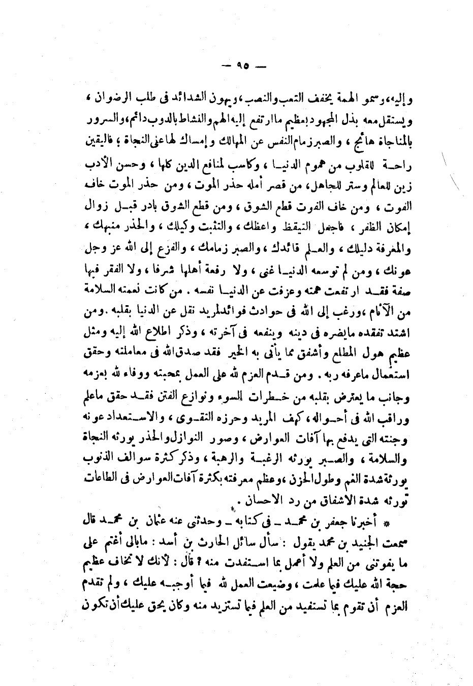 أَخْبَرَنَا جَعْفَرُ بْنُ مُحَمَّدٍ، فِي كِتَابِهِ , وَحَدَّثَنِي عَنْهُ عُثْمَانُ بْنُ مُحَمَّدٍ قَالَ: سَمِعْتُ الْجُنَيْدَ بْنَ مُحَمَّدٍ، يَقُولُ: سَأَلَ سَائِلٌ الْحَارِثَ بْنَ أَسَدٍ: مَا بَالِي أَغْتَمُّ عَلَى مَا يَفُوتَنِي مِنَ الْعِلْمِ وَلَا أَعْمَلُ بِمَا اسْتَفَدْتُ مِنْهُ؟ قَالَ: " §لِأَنَّكَ لَا تَخَافُ عَظِيمَ حُجَّةِ اللَّهِ عَلَيْكَ فِيمَا عَلِمْتَ وَضَيَّعْتَ الْعَمَلَ لِلَّهِ فِيمَا أَوْجَبَهُ عَلَيْكَ وَلَمْ تَقَدَّمِ الْعَزْمَ أَنْ تَقُومَ بِمَا تَسْتَفِيدُ مِنَ الْعِلْمِ فِيمَا تَسْتَزِيدُ مِنْهُ وَكَانَ يَحِقُّ عَلَيْكَ أَنْ تَكُونَ -[96]- بِمَا عَلِمْتَ وَلَزِمَتْكَ مِنَ اللَّهِ أَعْظَمُ الْحُجَّةِ؛ لِأَنَّكَ إِنْ تُضَيِّعْ حَقَّ اللَّهِ وَأَنْتَ لَا تَعْلَمُ خَيْرٌ مِنْ أَنْ تُضَيِّعَ حَقَّ اللَّهِ وَأَنْتَ تَعْلَمُ؛ لِأَنَّ الْجَاهِلَ لَا يَأْتِي بِتَعَمُّدٍ مِنْ قَلْبِهِ وَلَا جُرْأَةً وَاسْتِخْفَافًا بِاطِّلَاعِ رَبِّهِ، وَالْعَالِمُ بِمَا يَأْتِي مُتَعَمِّدًا تَرَكَ حَقَّ رَبِّهِ بَقِلَّةِ رَهْبَةٍ مِنَ اللَّهِ مُتَهَاوِنٌ بِنَظَرِ اللَّهِ مُتَعَرِّضٌ لِسَخَطِهِ وَهُوَ يَعْلَمُ وَيَتَشَوَّقُ لِحِرْمَانِ جِوَارِ اللَّهِ وَهُوَ يُبْصِرُ فَآثَرَ الْقَلِيلَ الْفَانِي عَلَى الْعَظِيمِ الْبَاقِي وَوَلَّى عَلَى النَّجَاةِ مِنَ الْعَذَابِ وَسَلَكَ الطَّرِيقَ إِلَى عَذَابِ الْجَحِيمِ وَسَمَحَتْ نَفْسُهُ بِالْجَنَّةِ وَأَسْلَمَهَا لِأَيْدِي الْعُقُوبَةِ، قُلْتُ: إِنِّي لَا أَقْوَى عَلَى الْحِلْمِ عِنْدَ الشَّتْمِ وَالْأَذَى، فَقَالَ: ثَقُلَ عَلَيْكَ كَظْمُ الْغَيْظِ وَخَفَّ عَلَيْكَ الِاشْتِفَاءُ؟ قُلْتُ: مِمَّ ثَقُلَ عَلَيَّ كَظْمُ الْغَيْظِ وَخَفَّ عَلَيَّ التَّشَفِّي؟ قَالَ: لِأَنَّكَ تَعُدُّ الْحِلْمَ ذُلًّا وَتَسْتَعْمِلُ السَّفَهَ أَنَفًا، قُلْتُ: فَبِمَ أَقْوَى عَلَى كَظْمِ الْغَيْظِ؟ قَالَ: بِصَبْرِ النَّفْسِ وَحَبْسِ الْجَوَارِحِ، قُلْتُ: بِمَ أَجْتَلِبُ صَبْرَ النَّفْسِ وَكَفَّ الْجَوَارِحِ؟ قَالَ: بِأَنْ تَعْقِلَ وَتَعْلَمَ أَنَّ الْحِلْمَ عِزٌّ وَزَيْنٌ، وَالسَّفَهَ ذُلٌّ وَشَيْنٌ، قُلْتُ: كَيْفَ أَعْقِلُ ذَلِكَ وَقَدْ حَلَّ بِقَلْبِي ضِدُّهُ فَغَلَبَ عَلَيْهِ أَنِّي إِنْ صَبَرْتُ عَلَى كَظْمِ الْغَيْظِ كَانَ ذَلِكَ إِذْلَالًا لِي مِمَّنْ آذَانِي وَلَزِمَ قَلْبِي الْأَنِفُ أَنْ يَكُونَ مَنْ شَتَمَنِي قَدْ قَهَرَنِي وَعَجَزْتُ عَنِ الِانْتِقَامِ مِنْهُ وَإِشْفَاءِ غَيْظِي؟ قَالَ: إِنَّمَا لَزِمَ قَلْبِكَ ذَلِكَ؛ لِأَنَّكَ لَمْ تَعْقِلْ ظَاهَرَ قُبْحِ السَّفَهِ مِنْكَ وَحُسْنَ سَتْرِ الْحِلْمِ عَلَيْكَ وَجَزِيلَ مَثُوبَةِ اللَّهِ لَكَ فِي آخِرَتِكَ، قُلْتُ: وَبِمَ أَعْرِفُ هَاتَيْنِ الْخَصْلَتَيْنِ؟ قَالَ: أَمَّا قُبْحُ السَّفَهِ وَزَوَالُ حُسْنِ رَدِّ الْحِلْمِ فِيمَا تَرَى مِنْ أَحْوَالِ شَاتِمِكَ وَمُؤْذِيكَ بِالْغَيْظِ وَالْغَضَبِ مِنْ لَوْنِهِ وَفَتْحِ عَيْنَيْهِ وَحُمْرَةِ وَجْهِهِ وَانْقِلَابِ عَيْنَيْهِ وَكَرَاهِيَةِ مَنْظَرِهِ وَاسْتِخْفَافِهِ بِنَفْسِهِ وَزَوَالِ السَّكِينَةِ وَالْوَقَارِ عَنْ بَدَنِهِ، فَأَنْتَ تُبَيِّنُ ذَلِكَ مِنْهُ وَيَرَاهُ كُلُّ عَاقِلٍ مِنْ فَاعِلِهِ، فَإِذَا بُلِيتَ بِذَلِكَ فَاذْكُرْ مَا أَعَدَّ اللَّهُ سُبْحَانَهُ وَتَعَالَى لِلْكَاظِمِينَ الْغَيْظَ مِنْ إِيجَابِ مَحَبَّتِهِ وَجَزِيلِ ثَوَابِهِ فَإِنَّ الِاشْتِفَاءَ يَنْقَضِي سَرِيعًا وَيَبْقَى سُوءُ عَاقِبَتِهِ فِي آخِرَتِكَ وَكَظْمِ غَيْظِكَ يَسْكُنُ سَرِيعًا وَيُدَّخَرُ ثَوَابُ اللَّهِ بِذَلِكَ فِي مَعَادِهِ وَلَا يَنْبَغِي لِلْعَاقِلِ أَنْ يَرْضَى بِدَنَاءَةِ نَفْسِهِ وَسُوءِ رَغْبَتِهِ بِأَنْ يَكُونَ مِمَّنْ تُرْضِيهِ
