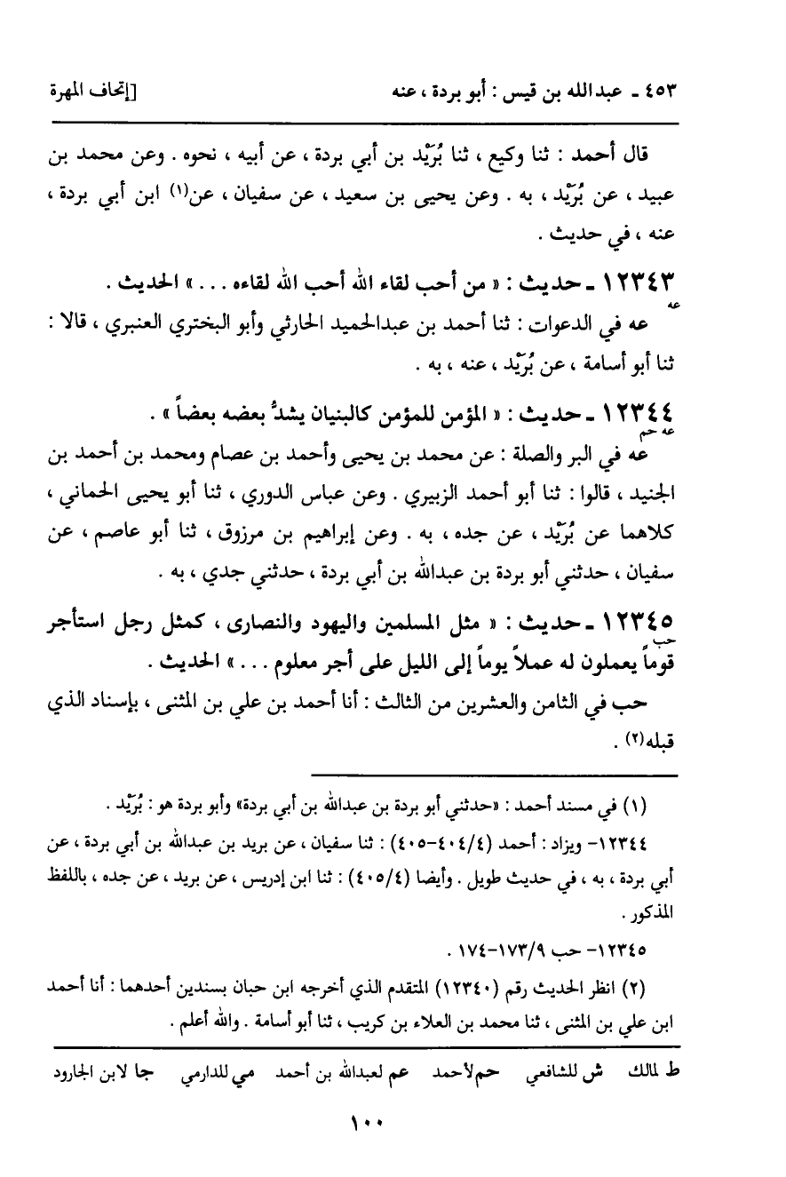 عه في البر والصلة: عن محمد بن يحيى، وأحمد بن عصام، ومحمد بن أحمد بن الجنيد: قالوا: ثنا أبو أحمد الزبيري. وعن عباس الدوري، ثنا أبو يحيى الحماني، كلاهما عن بريد، عن جده، به. وعن إبراهيم بن مرزوق، ثنا أبو عاصم، عن سفيان، حدثني أبو بردة بن عبد الله بن أبي بردة، حدثني جدي، به.