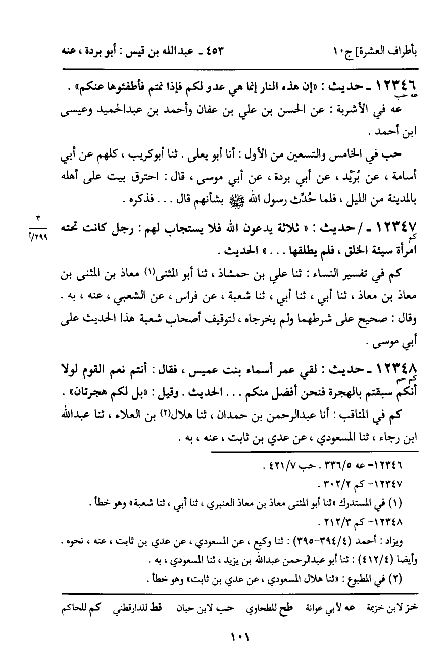 حب في الخامس والتسعين من الأول: أنا أبو يعلى. ثنا أبو كريب، كلهم عن أبي أسامة، عن بريد، عن أبي بردة، عن أبي موسى، قال: احترق بيت على أهله بالمدينة من الليل، فلما حدث رسول الله صلى الله عليه وسلم بشأنهم قال. . . . فذكره.
