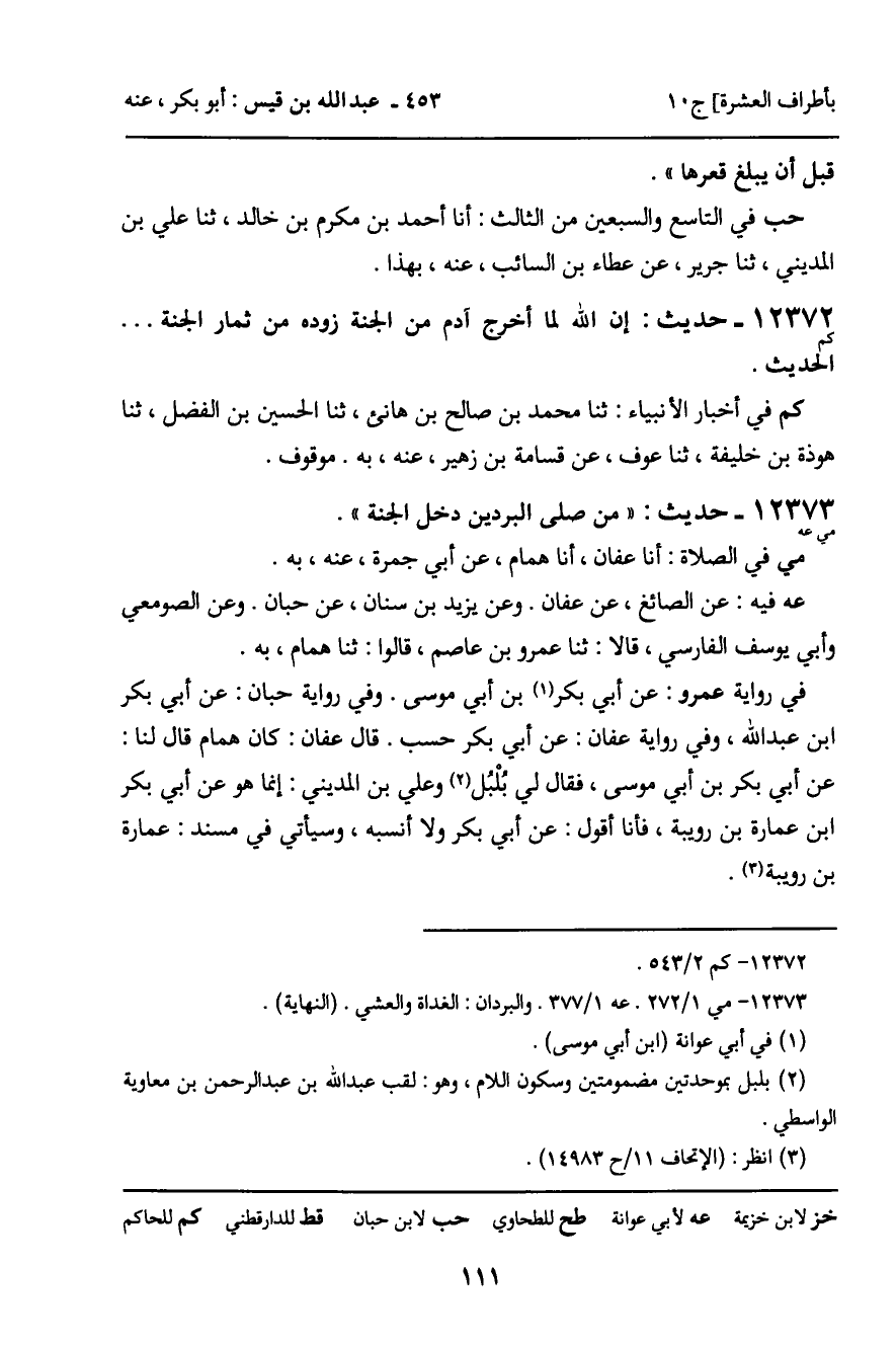 في رواية عمرو: عن أبي بكر بن أبي موسى. وفي رواية حبان: عن أبي بكر بن عبد الله، وفي رواية عفان: عن أبي بكر حسب. قال عفان: كان همام قال لنا: عن أبي بكر بن أبي موسى، فقال لي بلبل، وعلي بن المديني: إنما هو عن أبي بكر بن عمارة بن رويبة، فأنا أقول: عن أبي بكر ولا أنسبه، وسيأتي في مسند: عمارة بن رويبة.