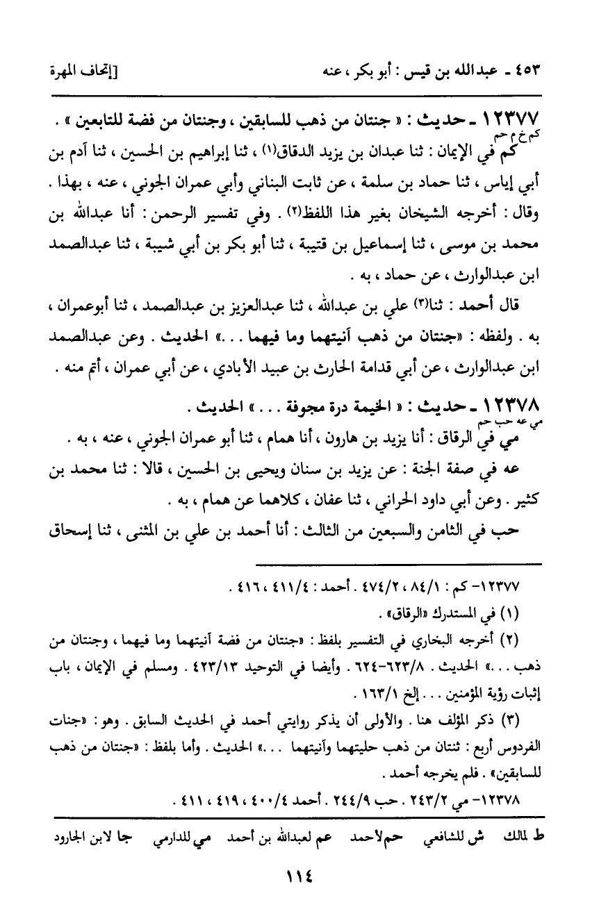 قال أحمد: ثنا علي بن عبد الله، ثنا عبد العزيز بن عبد الصمد، ثنا أبو عمران، به , ولفظه: " جنتان من ذهب آنيتهما وما فيهما. . . " الحديث. وعن عبد الصمد بن عبد الوارث، عن أبي قدامة الحارث بن عبيد الأبادي، عن أبي عمران، أتم منه.
