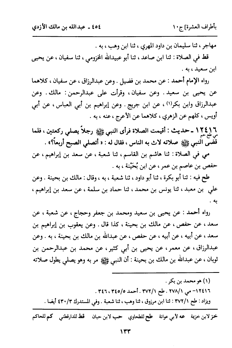 طح فيه: ثنا أبو بكرة، ثنا أبو داود، ثنا شعبة، به، وقال: مالك بن بحينة. وعن علي بن معبد، ثنا يونس بن محمد، ثنا حماد بن سلمة، عن سعد بن إبراهيم، به.