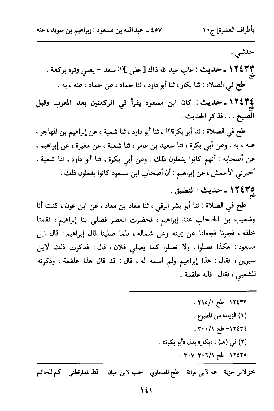 طح في الصلاة: ثنا أبو بشر الرقي، ثنا معاذ بن معاذ، عن ابن عون، كنت أنا، وشعيب بن الحبحاب، عند إبراهيم، فحضرت العصر فصلى بنا إبراهيم، فقمنا خلفه، فجرنا فجعلنا عن يمينه وعن شماله، فلما صلينا قال إبراهيم: قال ابن مسعود: هكذا فصلوا، ولا تصلوا كما يصلي فلان، قال: فذكرت ذلك لابن سيرين، فقال: هذا إبراهيم ولم أسمه له، قال: قد قال هذا علقمة، وذكرته للشعبي، فقال: قاله علقمة.