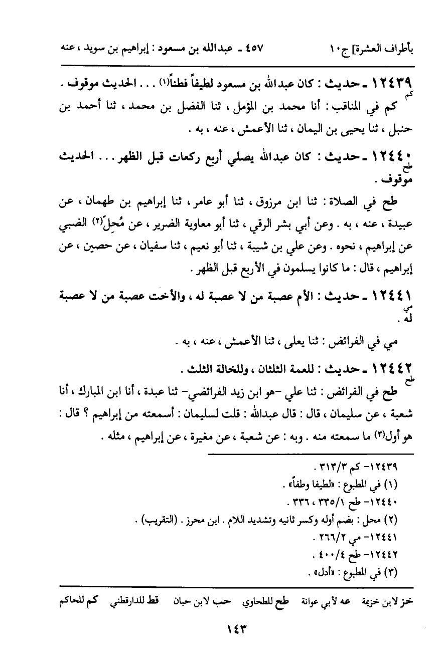 طح في الفرائض: ثنا علي هو ابن زيد الفرائضي، ثنا عبدة، أنا ابن المبارك، أنا شعبة، عن سليمان، قال: قال عبد الله: قلت لسليمان: أسمعته من إبراهيم؟ قال: