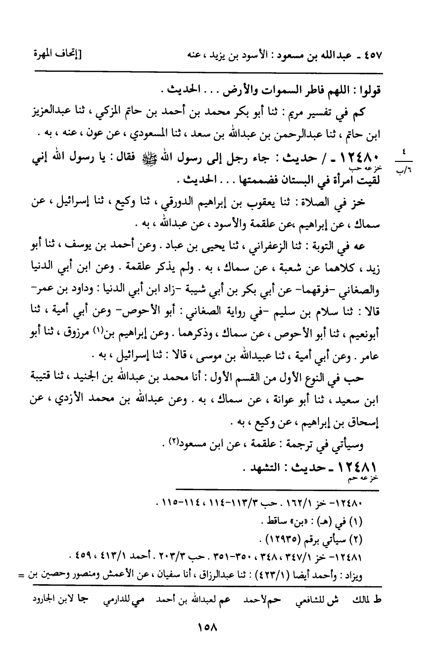 حب فيه: أنا ابن خزيمة، ثنا أحمد بن الأزهر، به. وفيه وفي الرابع والثلاثين من الخامس: أنا محمد بن عبد الرحمن بن محمد الدغولي، ثنا محمد بن يحيى، ثنا عبد الرزاق، أنا الثوري، عن أبي إسحاق، عن الأسود، وأبي الأحوص، وعن منصور، والأعمش، وحصين، وأبي هاشم، وحماد، كلهم عن أبي وائل، كلهم عن عبد الله، به. وله طريق في ترجمة: أبي وائل شقيق، عن ابن مسعود.