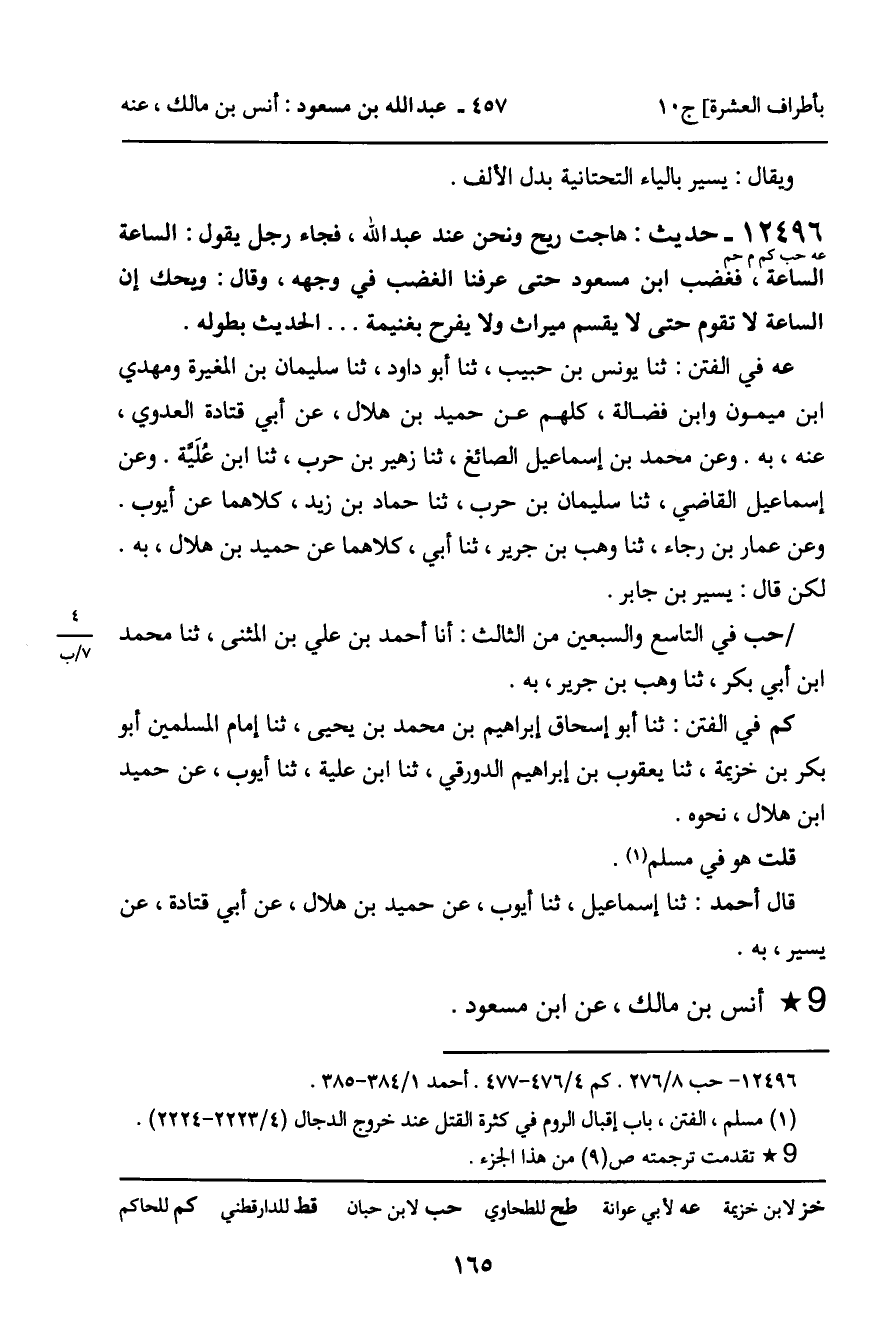 12496 - ويقال: يسير بالياء التحتانية بدل الألف. حديث (عه حب كم م حم) : " هاجت ريح ونحن عند عبد الله، فجاء رجل يقول: الساعة الساعة، فغضب ابن مسعود حتى عرفنا الغضب في وجهه، وقال: ويحك إن الساعة لا تقوم حتى لا يقسم ميراث ولا يفرح بغنيمة. . . " الحديث بطوله.