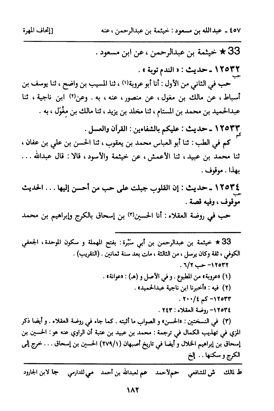 حب في روضة العقلاء: أنا الحسين بن إسحاق بالكرج، وإبراهيم بن محمد