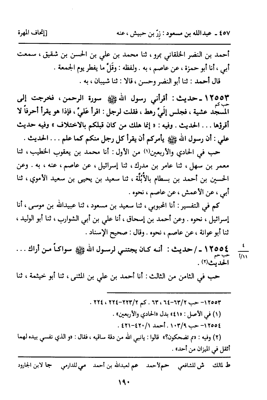 12553 - حديث (حب كم) : " أقرأني رسول الله صلى الله عليه وسلم سورة الرحمن، فخرجت إلى المسجد عشية، فجلس إلى رهط، فقلت لرجل: اقرأ علي، فإذا هو يقرأ حرفا لا أقرؤها. . . الحديث. وفيه: " إنما هلك من كان قبلكم بالاختلاف ". وفيه حديث علي: أن رسول الله صلى الله عليه وسلم يأمركم أن يقرأ كل رجل منكم كما علم. . . " الحديث.