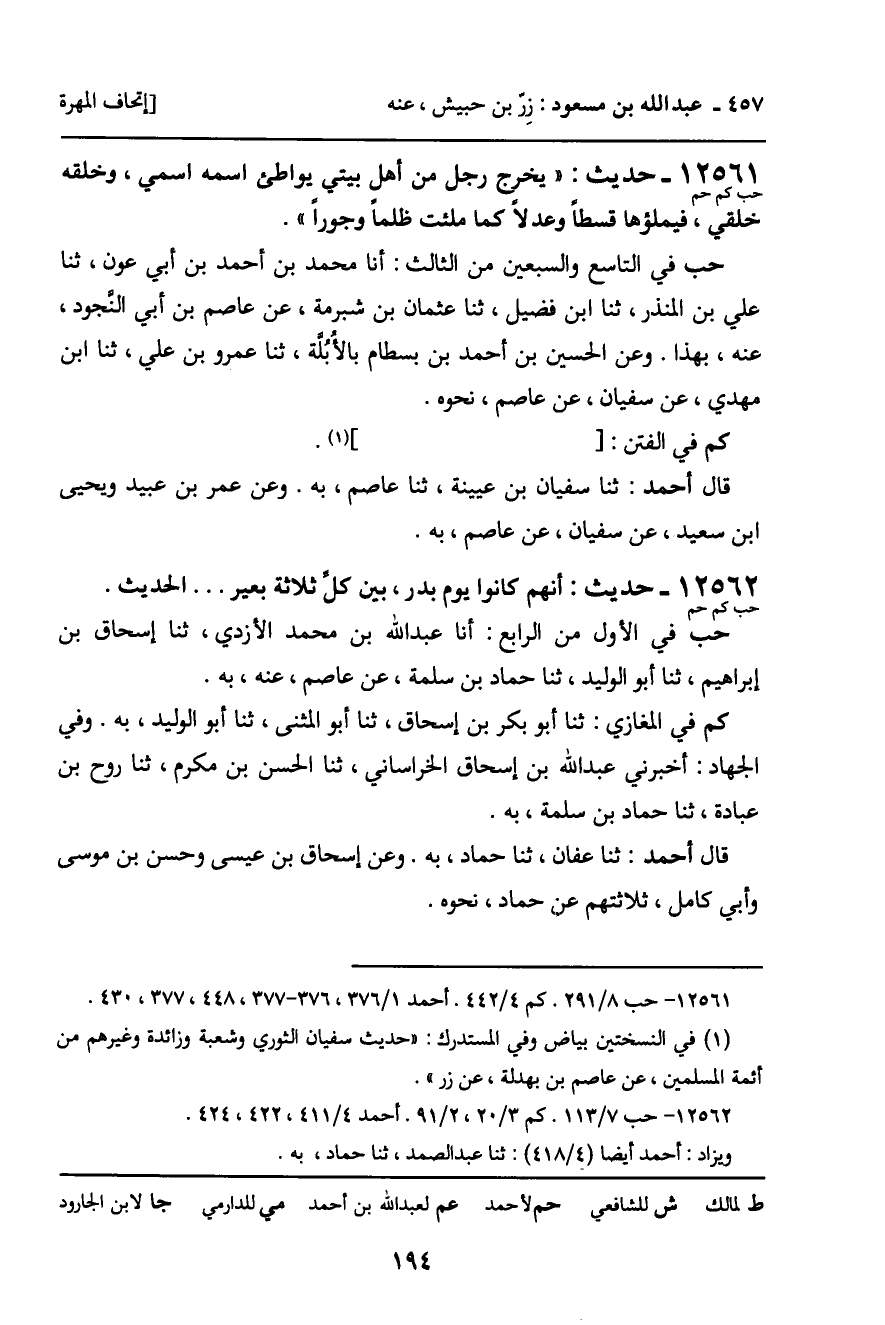12561 - حديث (حب كم حم) : " يخرج رجل من أهل بيتي يواطئ اسمه اسمي، وخلقه خلقي، فيملؤها قسطا وعدلا كما ملئت ظلما وجورا ".