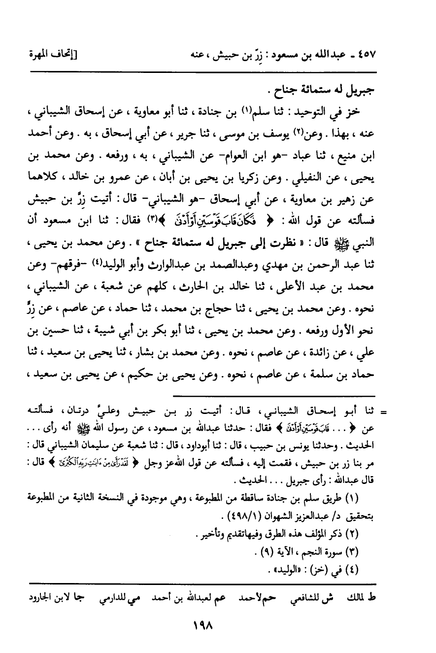 12573 - وعن زكريا بن يحيى بن أبان، عن عمرو بن خالد، كلاهما عن زهير بن معاوية، عن أبي إسحاق هو الشيباني، قال: أتيت زر بن حبيش فسألته عن قول الله: فَكَانَ قَابَ قَوْسَيْنِ أَوْ أَدْنَى [سورة: النجم، آية 9] فقال: ثنا ابن مسعود أن النبي صلى الله عليه وسلم قال: " نظرت إلى جبريل له ستمائة جناح ". وعن محمد بن يحيى، ثنا عبد الرحمن بن مهدي، وعبد الصمد بن عبد الوارث، وأبو الوليد، فرقهم وعن محمد بن عبد الأعلى، ثنا خالد بن الحارث، كلهم عن شعبة، عن الشيباني، نحوه. وعن محمد بن يحيى، ثنا حجاج بن محمد، ثنا حماد، عن عاصم، عن زر نحو الأول ورفعه. وعن محمد بن يحيى، ثنا أبو بكر بن أبي شبة، ثنا حسين بن علي، عن زائدة، عن عاصم، نحوه. وعن محمد بن بشار، ثنا يحيى بن سعيد، ثنا حماد بن سلمة، عن عاصم، نحوه. وعن يحيى بن حكيم، عن يحيى بن سعيد،