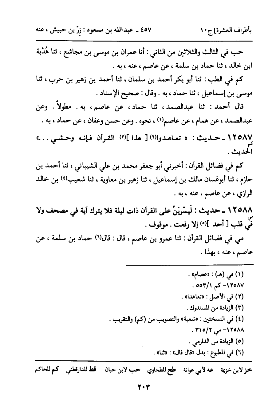 كم في فضائل القرآن: أخبرني أبو جعفر محمد بن علي الشيباني، ثنا أحمد بن حازم، ثنا أبو غسان مالك بن إسماعيل، ثنا زهير بن معاوية، ثنا شعيب بن خالد الرازي، عن عاصم، عن، به.