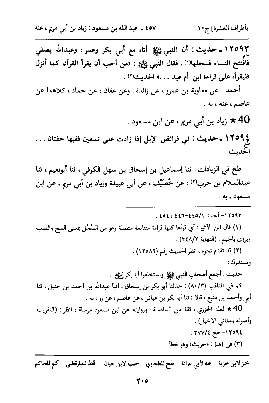 12593 - حديث (حم) : " أن النبي صلى الله عليه وسلم أتاه مع أبي بكر وعمر، وعبد الله يصلي فافتتح النساء فسحلها، فقال النبي صلى الله عليه وسلم: " من أحب أن يقرأ القرآن كما أنزل فليقرأه على قراءة ابن أم عبد. . . " الحديث.
