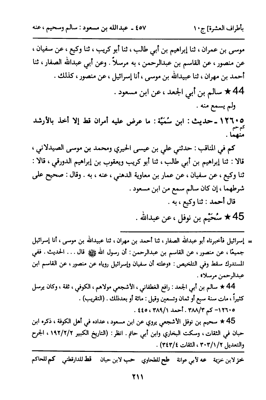 كم في المناقب: حدثني علي بن عيسى الحيري، ومحمد بن موسى الصيدلاني، قالا: ثنا إبراهيم بن أبي طالب، ثنا أبو كريب، ويعقوب بن إبراهيم الدورقي، قالا: ثنا وكيع، عن سفيان، عن عمار بن معاوية الدهني، عنه، به. وقال: صحيح على شرطهما، إن كان سالم سمع من ابن مسعود.