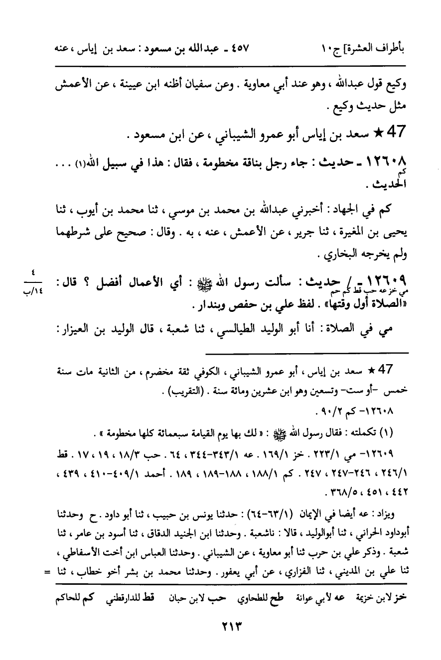 حب في النوع الأول من القسم الأول: أنا الفضل بن الحباب الجمحي، ثنا أبو الوليد الطيالسي، ومحمد بن كثير العبدي، وحفص بن عمر الحوضي، قالوا: ثنا شعبة، به. وعن الحسن بن سفيان، عن ابن أبي شيبة، عن علي بن مسهر، عن الشيباني، عن الوليد بن العيزار، به. وعن محمد بن إسحاق بن خزيمة، وعمر بن محمد الهمداني، والحسن بن سفيان، عن بندار، به. وقال: لفظ: " الصلاة في أول وقتها " تفرد به عثمان بن عمر، هكذا قال. وفي الثامن من الرابع: أنا عبد الله بن محمد الأزدي، ثنا إسحاق بن إبراهيم، أنا جرير، عن الحسن بن عبيد الله، عن أبي عمرو الشيباني، به. وأعاده فيه: عن عمر بن محمد الهمداني بسنده. وفي الصلاة: عن أبي خليفة، به. وعن الحسن، وابن خزيمة، وعمر بن محمد، به.
