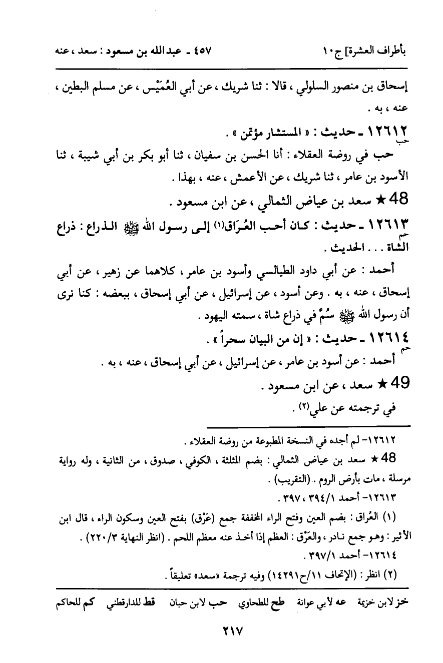 12613 - حديث (حم) : " كان أحب العراق إلى رسول الله صلى الله عليه وسلم الذراع: ذراع الشاة. . . . . " الحديث.