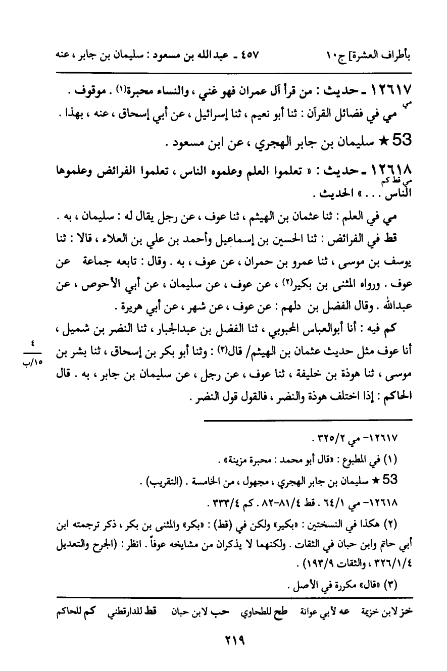 قط في الفرائض: ثنا الحسين بن إسماعيل، وأحمد بن علي بن العلاء، قالا: ثنا يوسف بن موسى، ثنا عمرو بن حمران، عن عوف، به. وقال: تابعه جماعة عن عوف. ورواه المثنى بن بكير، عن عوف، عن سليمان، عن أبي الأحوص، عن عبد الله. وقال الفضل بن دلهم: عن عوف، عن شهر، عن أبي هريرة.