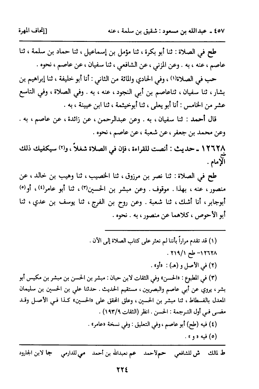 طح في الصلاة: ثنا نصر بن مرزوق، ثنا الخصيب، ثنا وهيب بن خالد، عن منصور، عنه، بهذا. موقوف. وعن مبشر بن الحسين، ثنا أبو عامر، أو أبو جابر، أنا أشك، ثنا شعبة. وعن روح بن الفرج، ثنا يوسف بن عدي، ثنا أبو الأحوص، كلاهما عن منصور، به. نحوه.