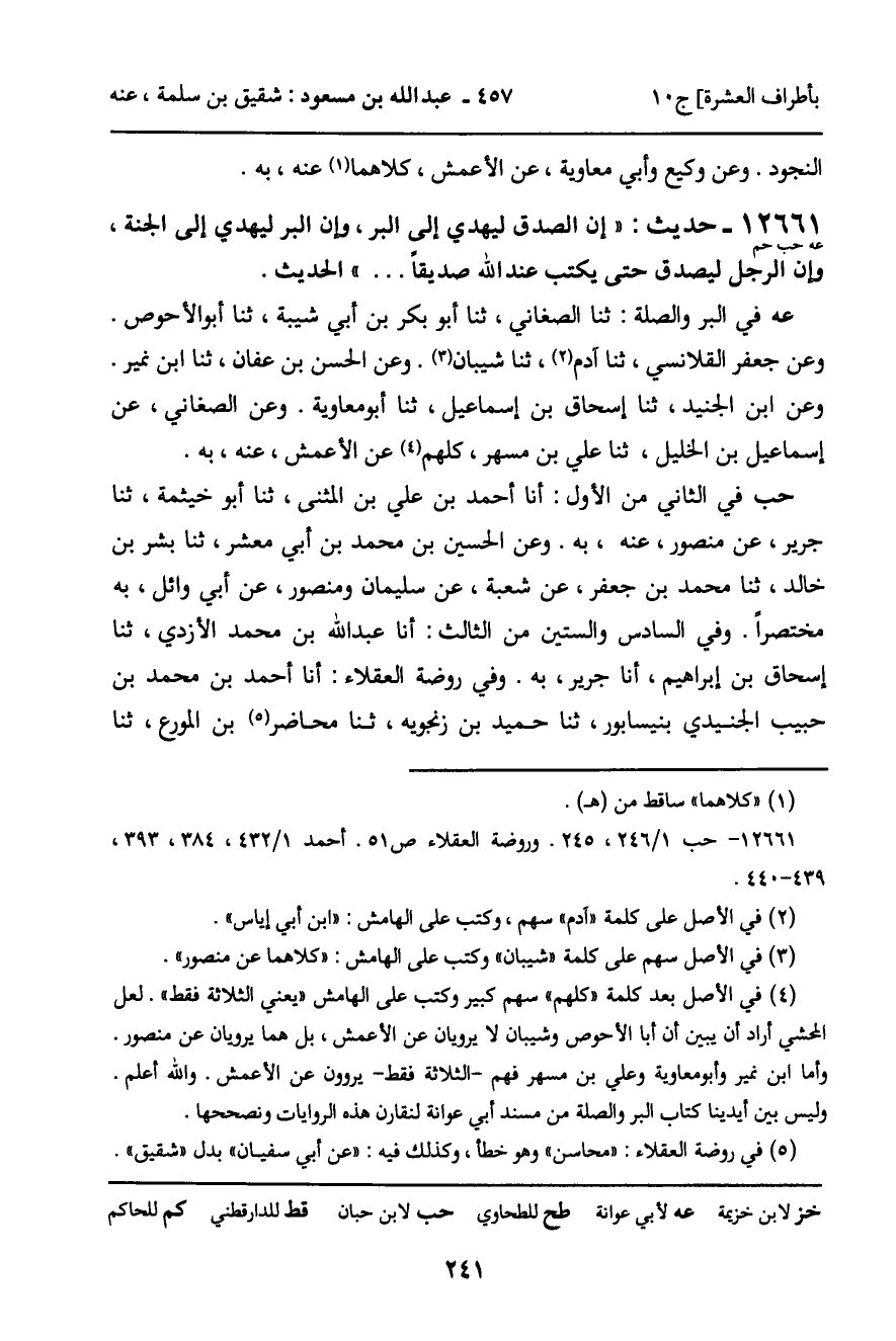 حب في الثاني من الأول: أنا أحمد بن علي بن المثنى، ثنا أبو خيثمة، ثنا جرير، عن منصور، عنه، به. وعن الحسين بن محمد بن أبي معشر، ثنا بشر بن خالد، ثنا محمد بن جعفر، عن شعبة، عن سليمان، ومنصور، عن أبي وائل، به مختصرا. وفي السادس والستين من الثالث: أنا عبد الله بن محمد الأزدي، ثنا إسحاق بن إبراهيم، أنا جرير، به. وفي روضة العقلاء: أنا أحمد بن محمد بن حبيب الجنيدي بنيسابوري، ثنا حميد بن زنجويه، ثنا محاضر بن المورع، ثنا