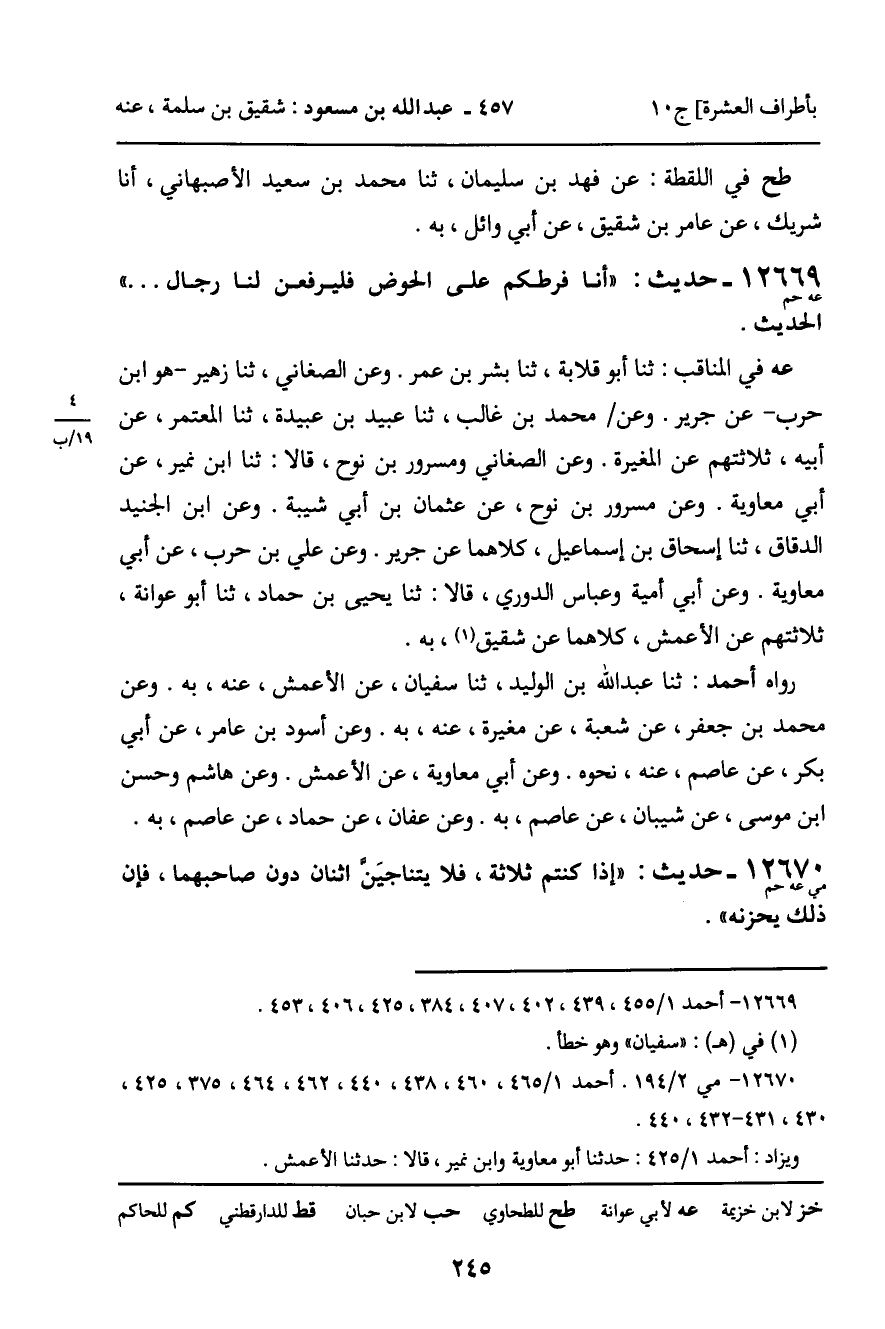 عه في المناقب: ثنا أبو قلابة، ثنا بشر بن عمر. وعن الصغاني، ثنا زهير هو ابن حرب، عن جرير، وعن محمد بن غالب، ثنا عبيد بن عبيدة، ثنا المعتمر، عن أبيه، ثلاثتهم عن المغيرة، وعن الصغاني، ومسرور بن نوح، قالا: ثنا ابن نمير، عن أبي معاوية. وعن مسرور بن نوح، عن عثمان بن أبي شيبة. وعن ابن الجنيد الدقاق، ثنا إسحاق بن إسماعيل، كلاهما عن جرير، وعن علي بن حرب، عن أبي معاوية، وعن أبي أمية، وعباس الدوري، قالا: ثنا يحيى بن حماد، ثنا أبو عوانة، ثلاثتهم عن الأعمش، كلاهما عن شقيق، به.