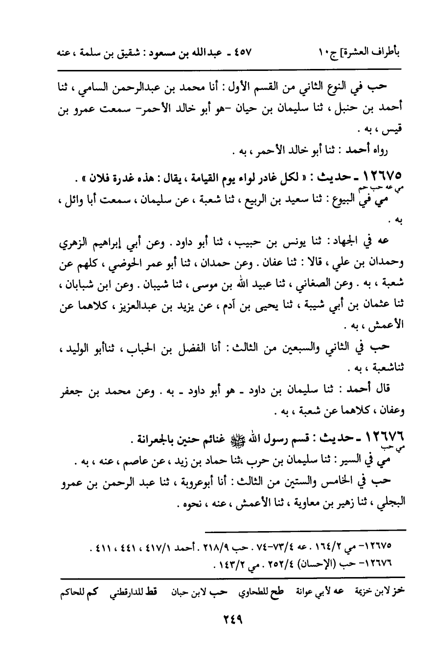عه في الجهاد: ثنا يونس بن حبيب، ثنا أبو داود. وعن أبي إبراهيم الزهري، وحمدان بن علي، قال: ثنا عفان. وعن حمدان، ثنا أبو عمر الحوضي، كلهم عن شعبة، به. وعن الصغاني، ثنا عبيد الله بن موسى، ثنا شيبان، عن ابن شبابان.