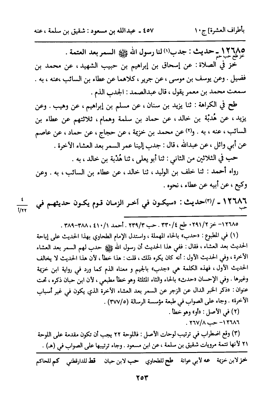 طح في الكراهية: ثنا يزيد بن سنان، عن مسلم بن إبراهيم، عن وهيب. وعن يزيد، عن هدبة بن خالد، عن حماد بن سلمة، وهمام، ثلاثتهم عن عطاء بن السائب، عنه، به. وعن حماد بن سلمة، وهمام، ثلاثتهم عن عطاء بن السائب، عنه، به. وعن محمد بن خزيمة، عن حجاج، حماد، عن عاصم، عن أبي وائل، عن عبد الله، قال: جدب إلينا عمر السمر بعد العشاء الآخرة.