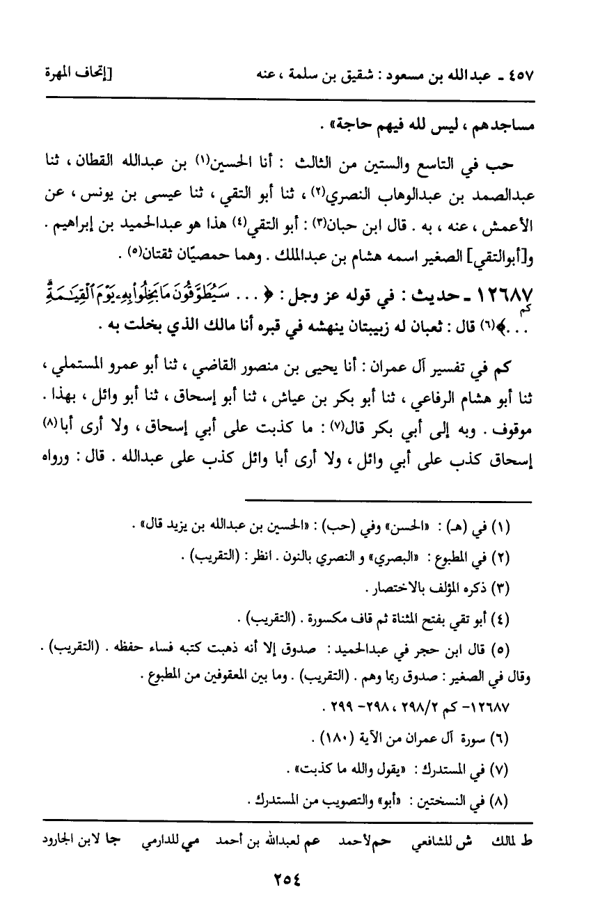 كم في تفسير آل عمران: أنا يحيى بن منصور القاضي، ثنا أبو عمرو المستملي، ثنا أبو هشام الرفاعي، ثنا أبو بكر بن عياش، ثنا أبو إسحاق، ثنا أبو وائل، بهذا موقوف. وبه إلى أبي بكر قال: ما كذبت على أبي إسحاق، ولا أرى أبا إسحاق كذب على أبي وائل، ولا أرى أبا وائل كذب على عبد الله. قال: ورواء