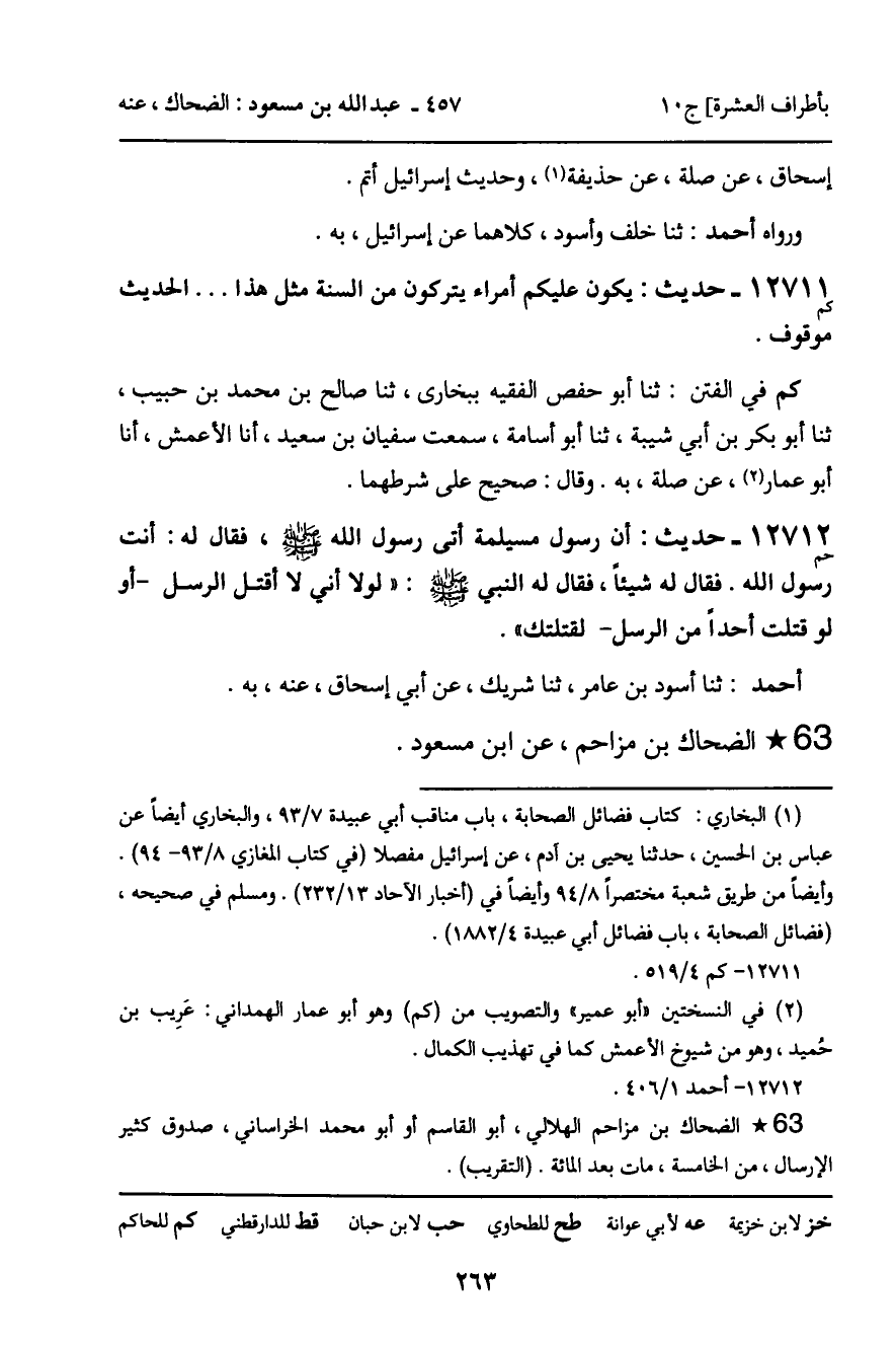 كم في الفتن: ثنا أبو حفص الفقيه ببخارى، ثنا صالح بن محمد بن حبيب، ثنا أبو بكر بن أبي شيبة، ثنا أبو أٍسامة، سمعت سفيان بن سعيد، أنا الأعمش، أنا عمار، عن صلة، به. وقال: صحيح على شرطهما.