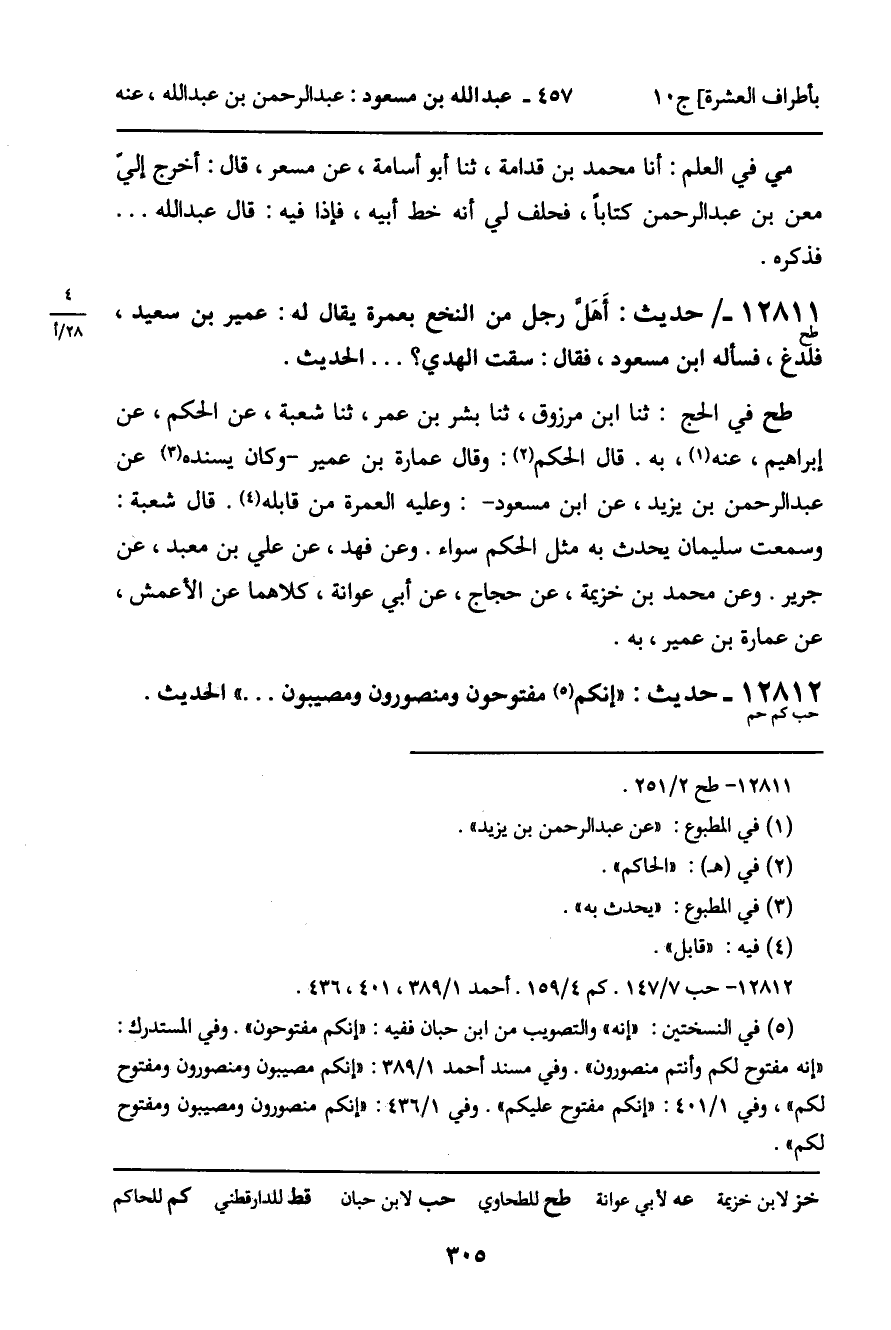 12811 - حديث (طح) : أهل رجل من النخع بعمرة يقال له: عمير بن سعيد، فلدغ، فسأله ابن مسعود، فقال: سقت الهدي؟ . . . الحديث.