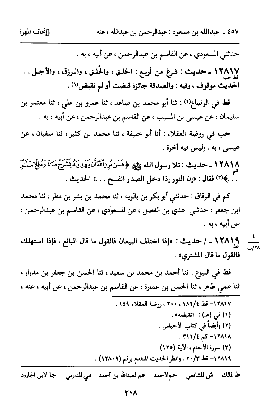 12817 - حديث (قط حب) : فرغ من أربع: الخلق، والخلق، والرزق، والأجل. . . . الحديث موقوف، وفيه: والصدقة جائزة قبضت أو لم تقبض.