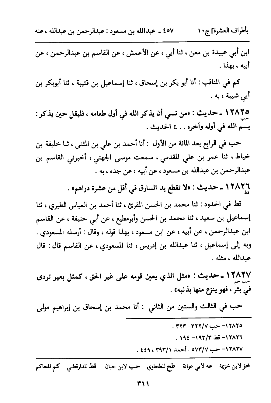 قط في الحدود: ثنا محمد بن الحسن المقرئ، ثنا أحمد بن العباس الطبري، ثنا إسماعيل بن سعيد، ثنا محمد بن الحسن، وأبو مطيع، عن أبي حنيفة، عن القاسم بن عبد الرحمن، عن أبيه، عن ابن مسعود، بهذا قوله، وقال: أرسله المسعودي. وبه إلى إسماعيل، ثنا عبد الله بن إدريس، ثنا المسعودي، عن القاسم قال: قال عبد الله، مثله.