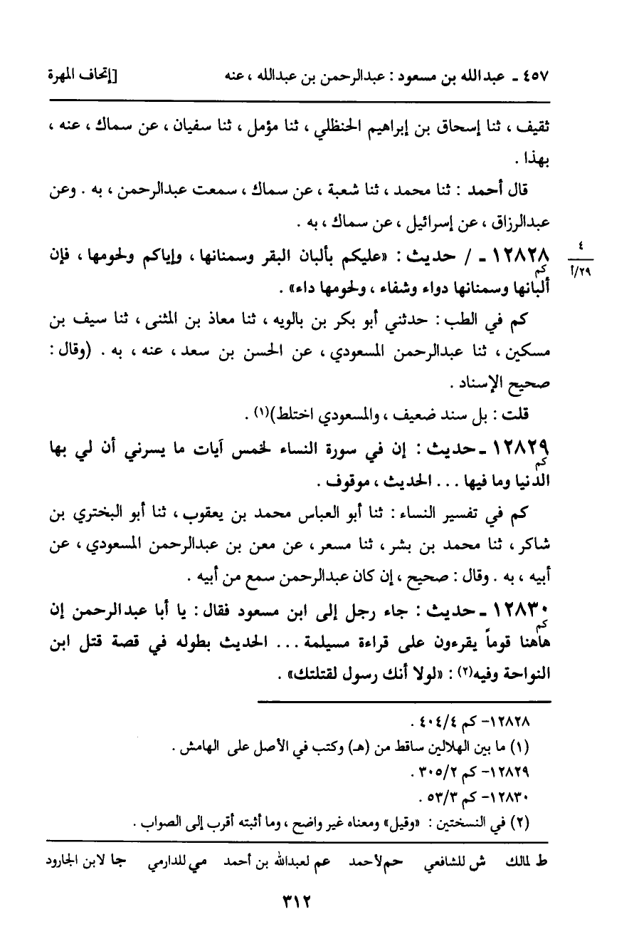 12828 - حديث (كم) : " عليكم بألبان البقر وسمنانها، وإياكم ولحومها، فإن ألبانها وسمنانها دواء وشفاء، ولحومها داء ".