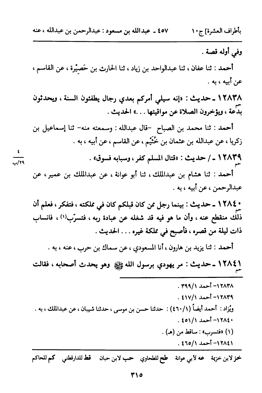 12840 - حديث (حم) : " بينما رجل ممن كان قبلكم كان في مملكته، فتفكر، فعلم أن ذلك منقطع عنه، وأن ما هو عليه قد شغله عن عبادة به، فتسرب، فانساب ذات ليلة من قصره، فأصبح في مملكة غيره. . " الحديث.
