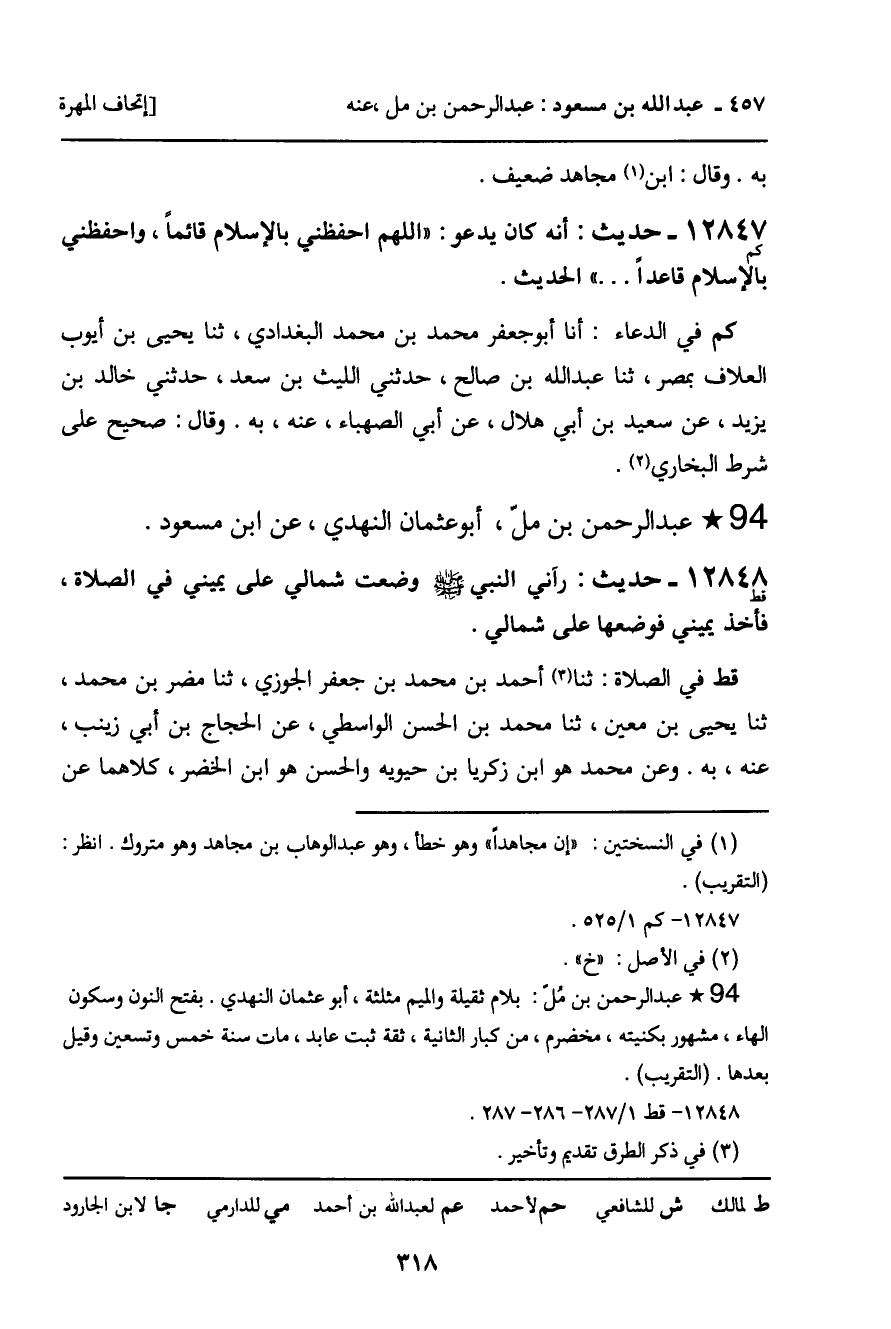 12848 - حديث (قط) : " رآني النبي صلى الله عليه وسلم وضعت شمالي على يميني في الصلاة، فأخذ يميني فوضعها على شمالي ".