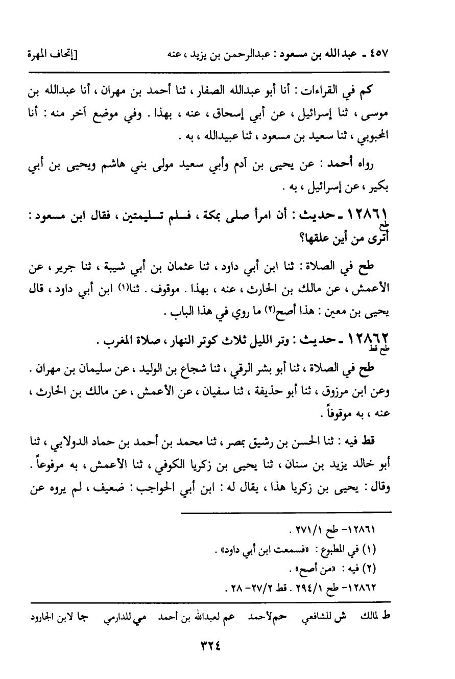 12861 - حديث (طح) : أن امرأ صلى بمكة، فسلم تسليمتين، فقال ابن مسعود: أترى من أين علقها؟ .