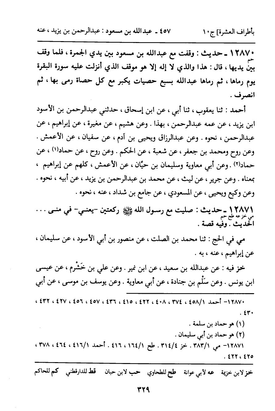 12871 - حديث (مي خز عه طح حم) : " صليت مع رسول الله صلى الله عليه وسلم ركعتين يعني: في منى. . . " الحديث. وفيه قصة.