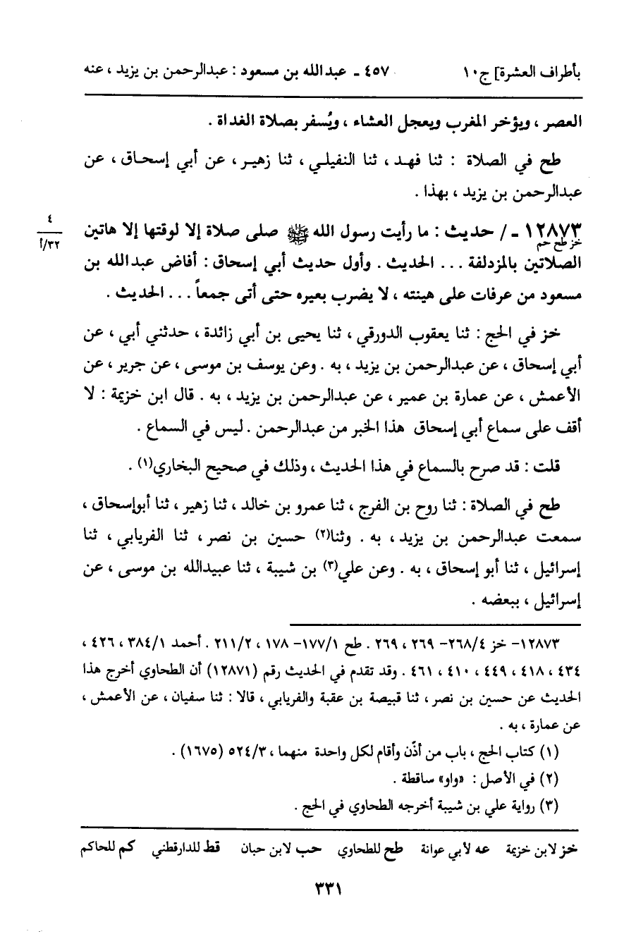 12873 - حديث (خز طح حم) : " ما رأيت رسول الله صلى الله عليه وسلم صلى صلاة إلا لوقتها إلا هاتين الصلاتين بالمزدلفة. . . . " الحديث. وأول حديث أبي إسحاق: أفاض عبد الله بن مسعود من عرفات على هينته، لا يضرب بعيره حتى أتى جمعا. . . الحديث.