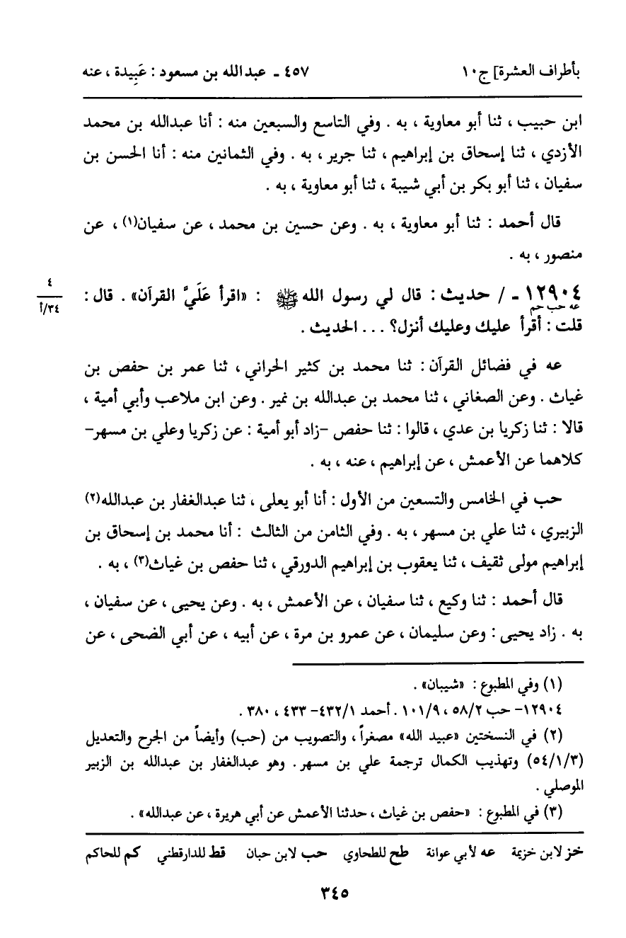 عه في فضائل القرآن: ثنا محمد بن كثير الحراني، ثنا عمر بن حفص بن غياث. وعن الصغاني، ثنا محمد بن عبد الله بن نمير. وعن ابن ملاعب، وأبي أمية، قال: ثنا زكريا بن عدي، قالوا: ثنا حفص ـ زاد أبو أمية: عن زكريا، وعلي بن مسهر، كلاهما عن الأعمش، عن إبراهيم، عنه، به.