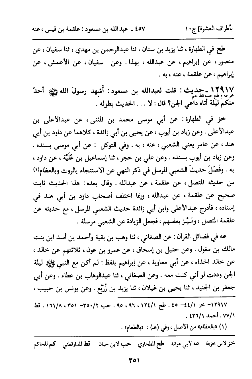 12917 - حديث (خز عه م طح حب قط حم) : قلت لعبد الله بن مسعود: " أشهد رسول الله صلى الله عليه وسلم أحد منكم ليلة أتاه داعي الجن؟ قال: لا. . . " الحديث بطوله.