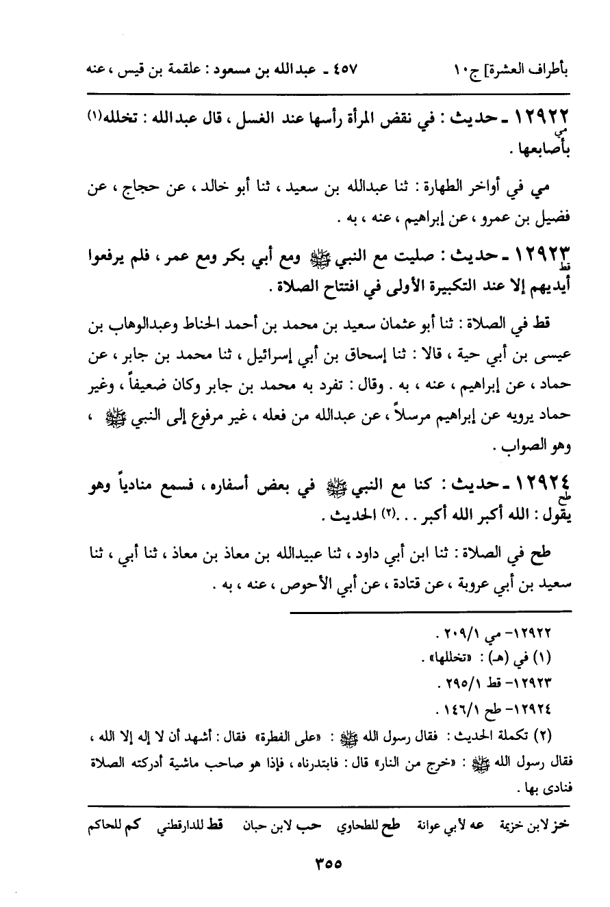 قط في الصلاة: ثنا أبو عثمان سعيد بن محمد بن أحمد الحناط، وعبد الوهاب بن عيسى بن أبي حية، قال: ثنا إسحاق بن أبي إسرائيل، ثنا محمد بن جابر، عن حماد، عن إبراهيم، عنه، به. وقال: تفرد به محمد بن جابر ضعيفا، وغير حماد يرويه، عن إبراهيم مرسلا، عن عبد الله من فعله، غير مرفوع إلى النبي صلى الله عليه وسلم، وهو الصواب.