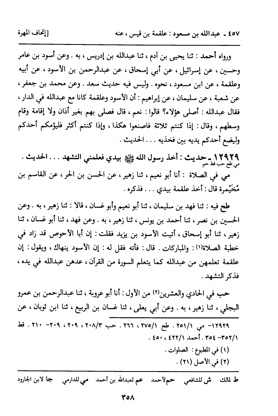 وعن فهد، ثنا أبو غسان، ثنا زهير، ثنا أبو أسحاق، أتيت الأسود بن يزيد فقلت: إن أبا الأحوص قد زاد في خطبة الصلاة: والمباركات. قال: فأته فقل له: إن الأسود ينهاك، ويقول: إن علقمة تعلمهن من عبد الله كما يتعلم السورة من القرآن، عدهن عبد الله في يده، فذكر التشهد.