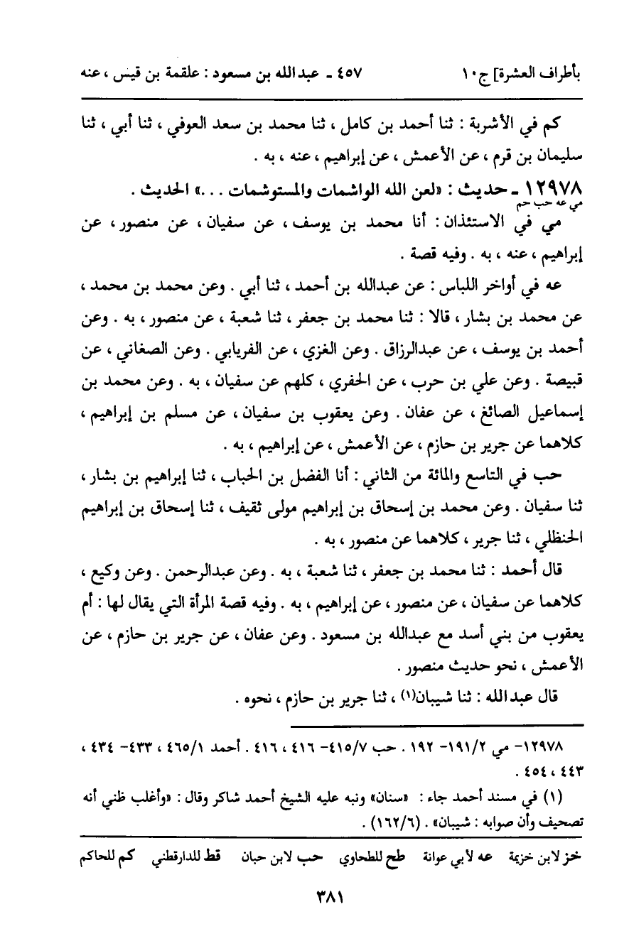 قال أحمد: ثنا محمد بن جعفر، ثنا شعبة، به. وعن عبد الرحمن. وعن وكيع، كلاهما عن سفيان، عن منصور، عن إبراهيم، به. وفيه قصة المرأة التي يقال لها: أم يعقوب من بني أسد مع عبد الله بن مسعود. وعن عفان، عن جرير بن حازم، عن الأعمش، نحو حديث منصور.