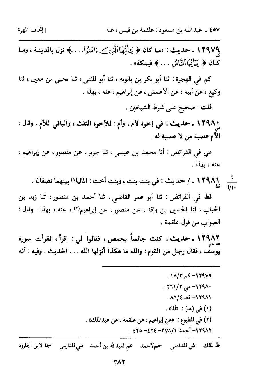 قط في الفرائض: ثنا أبو عمر القاضي، ثنا أحمد بن منصور، ثنا زيد بن الحباب، ثنا الحسين بن واقد، عن منصور، عن إبراهيم، عنه، بهذا. وقال: الصواب من قوله علقمة.